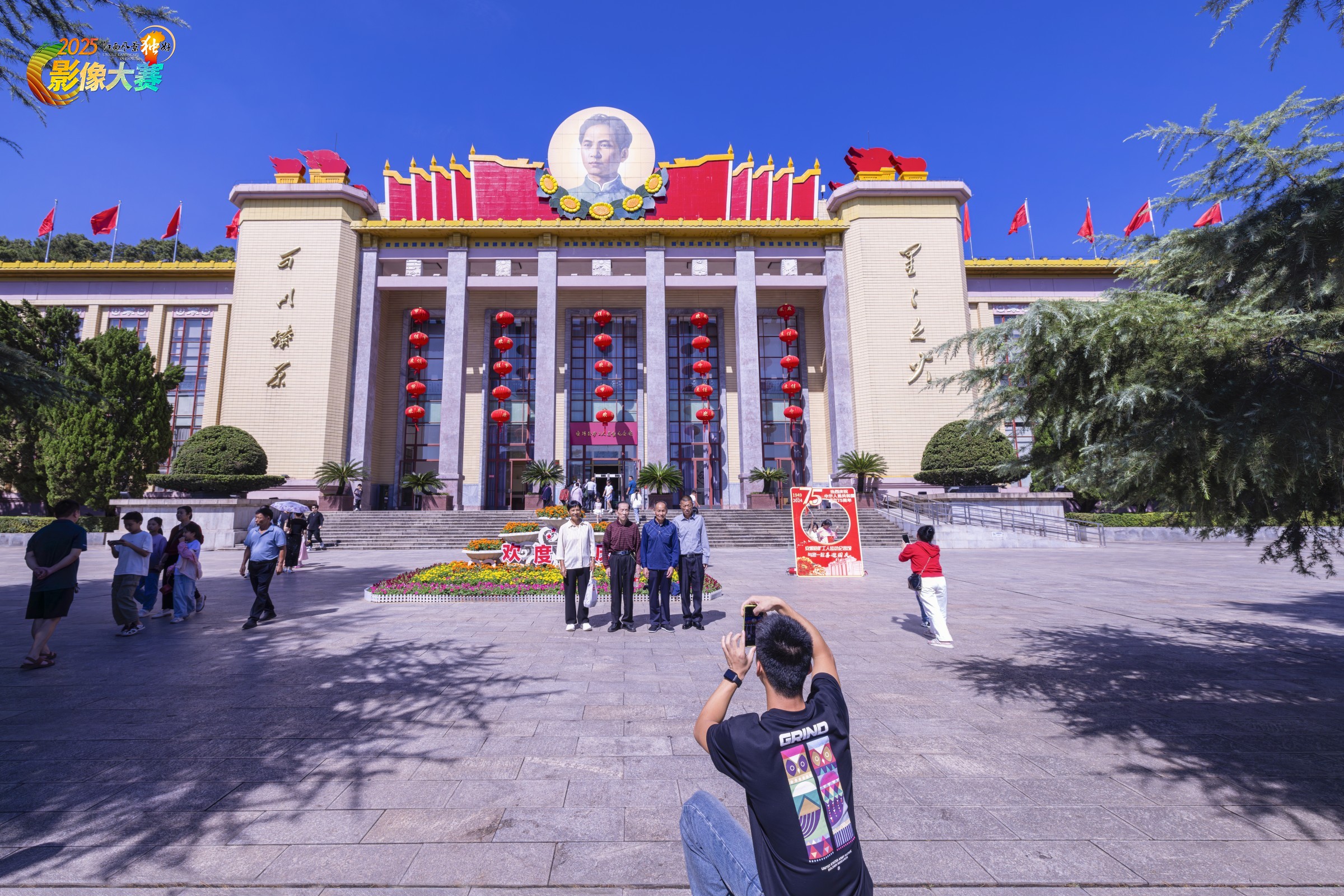 萍乡市安源纪念馆前,老人们重游故地,合影留念。