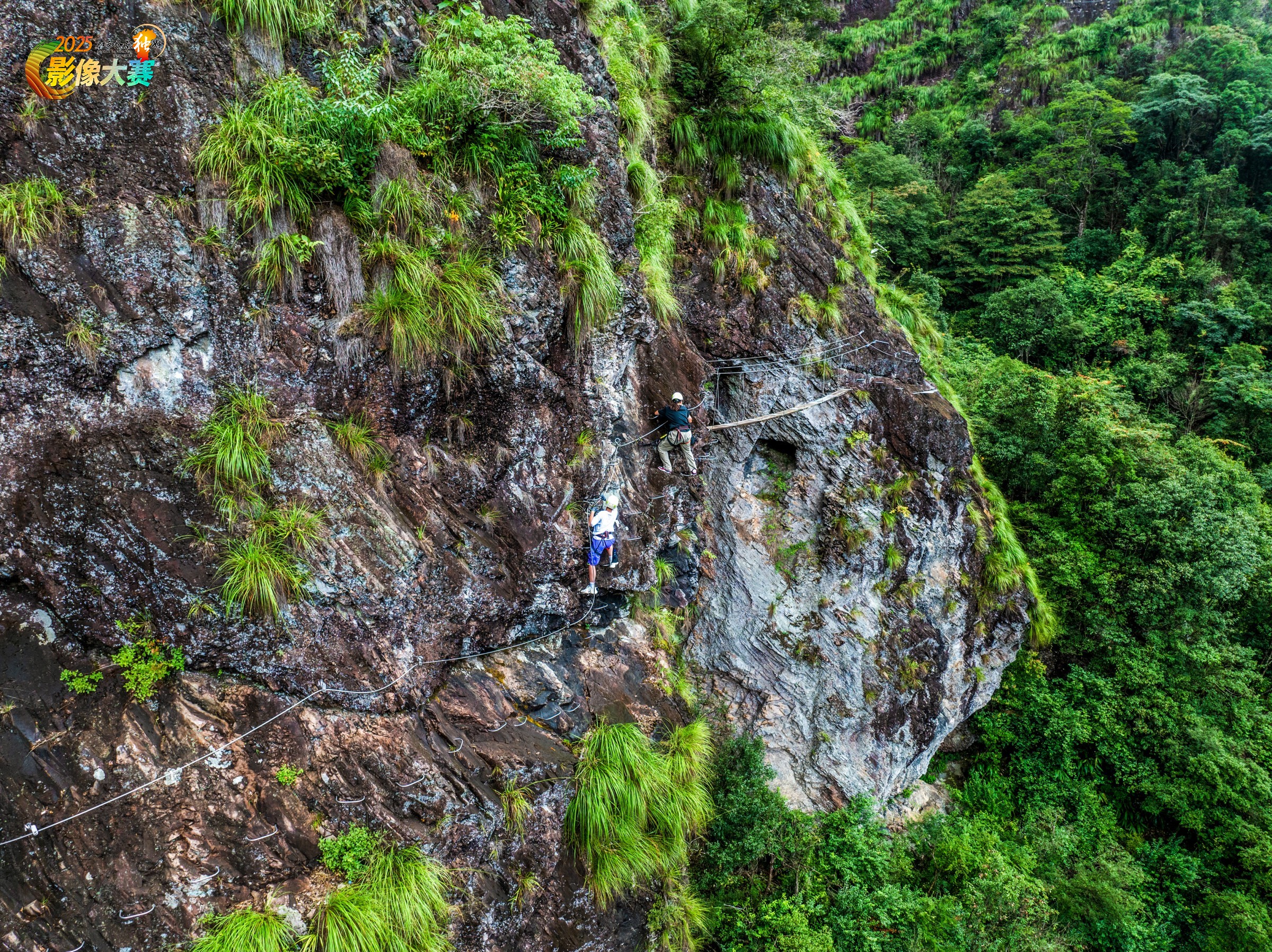 “绝壁探幽” 点明场景是在陡峭的山壁上探寻幽深之境,“勇者攀青云” 突出攀爬者的勇敢,仿佛向着青云攀登,既体现出活动的惊险刺激,又赋予其一种向上的豪迈感。