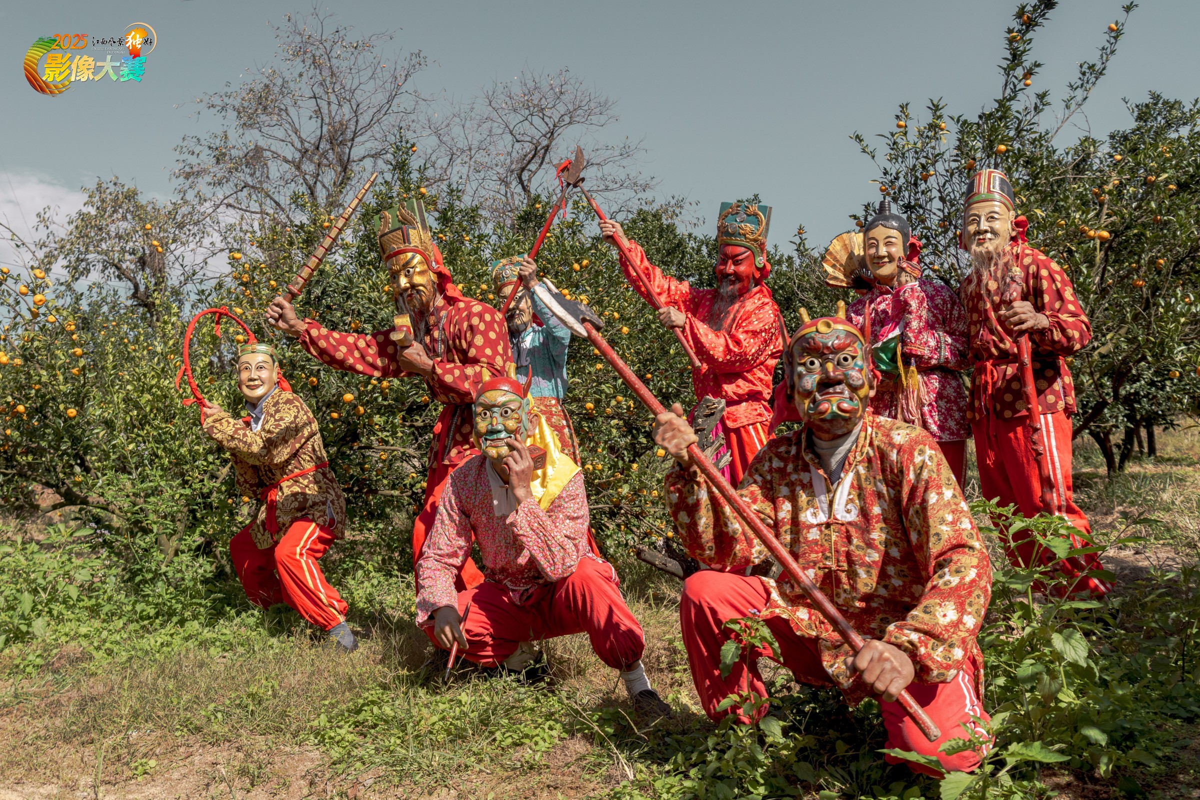 2023年11月19日,江西省南丰县白舍镇,村民们在桔园跳傩庆丰。