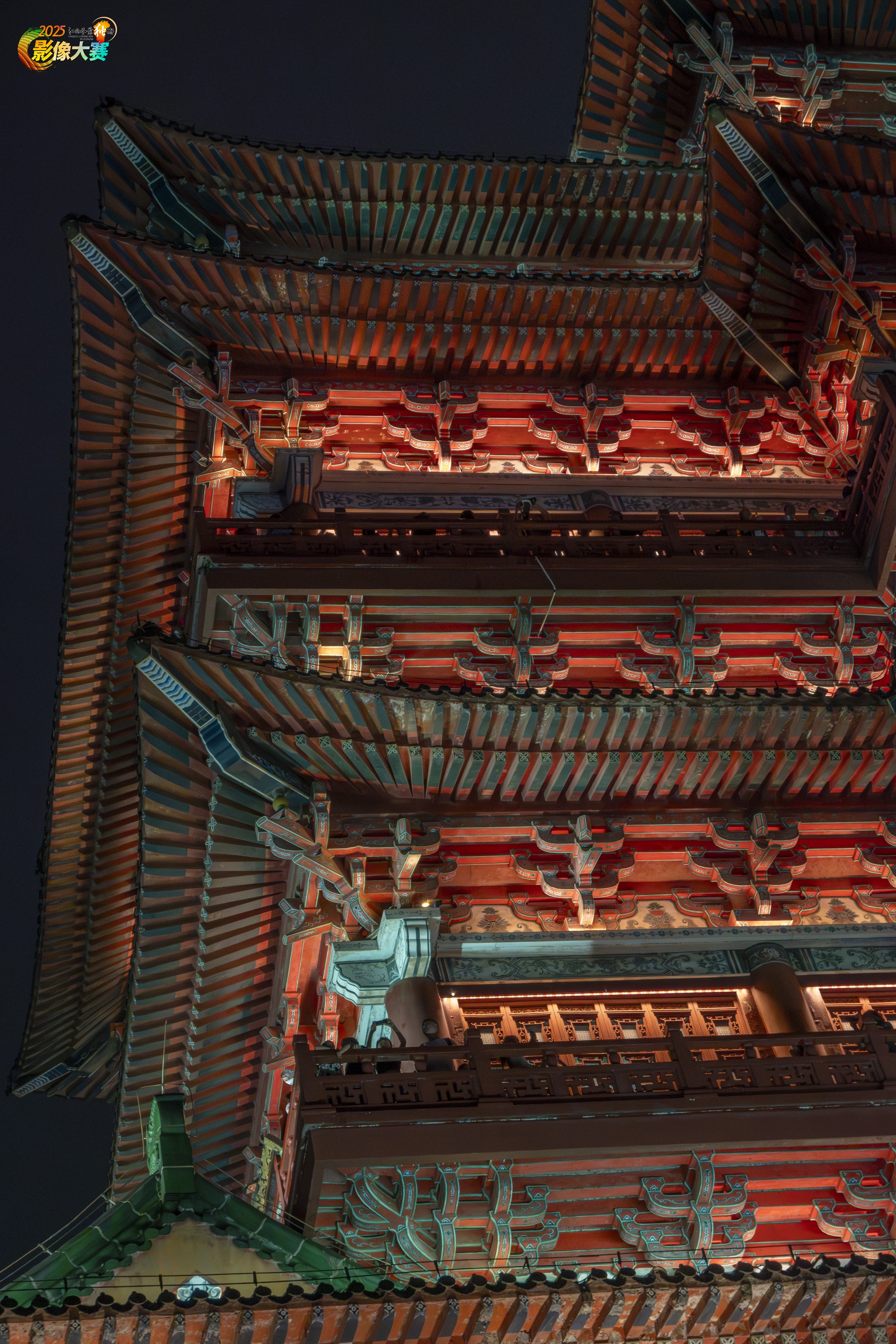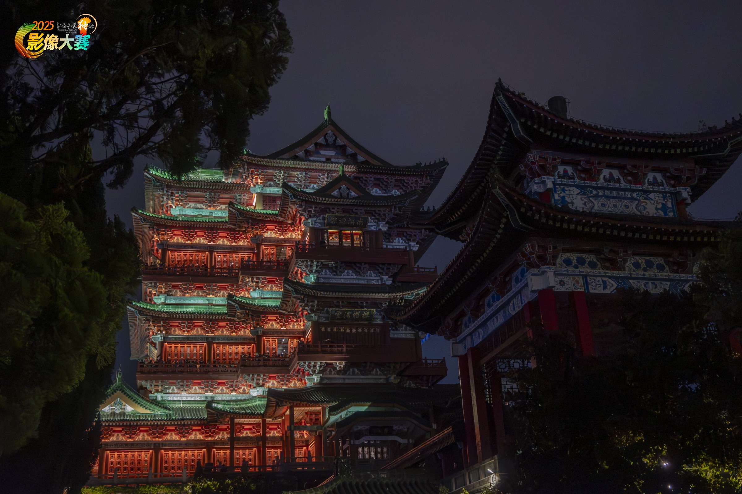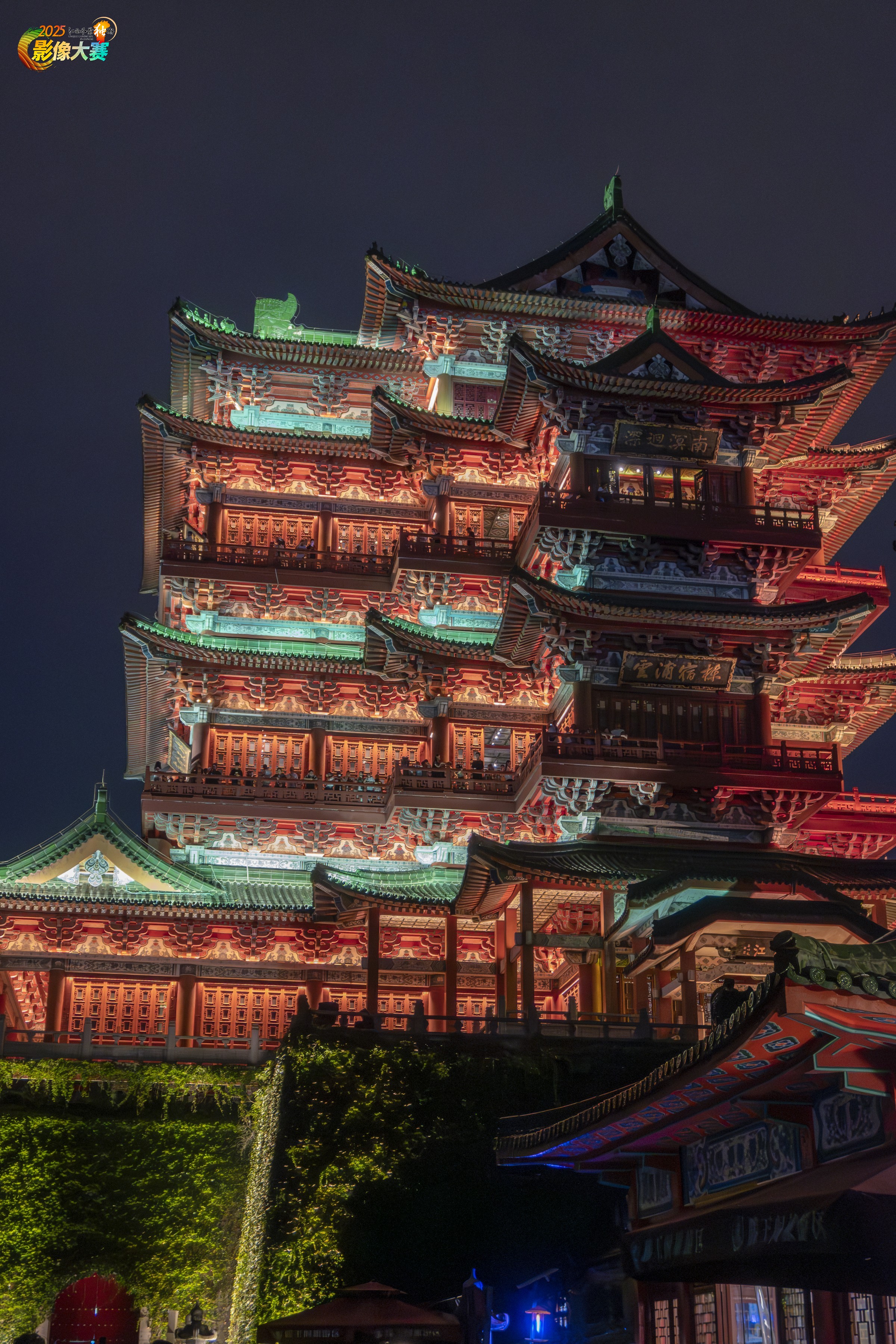 滕王阁侧面的牌匾,在霓虹灯照射下充满了光影感。