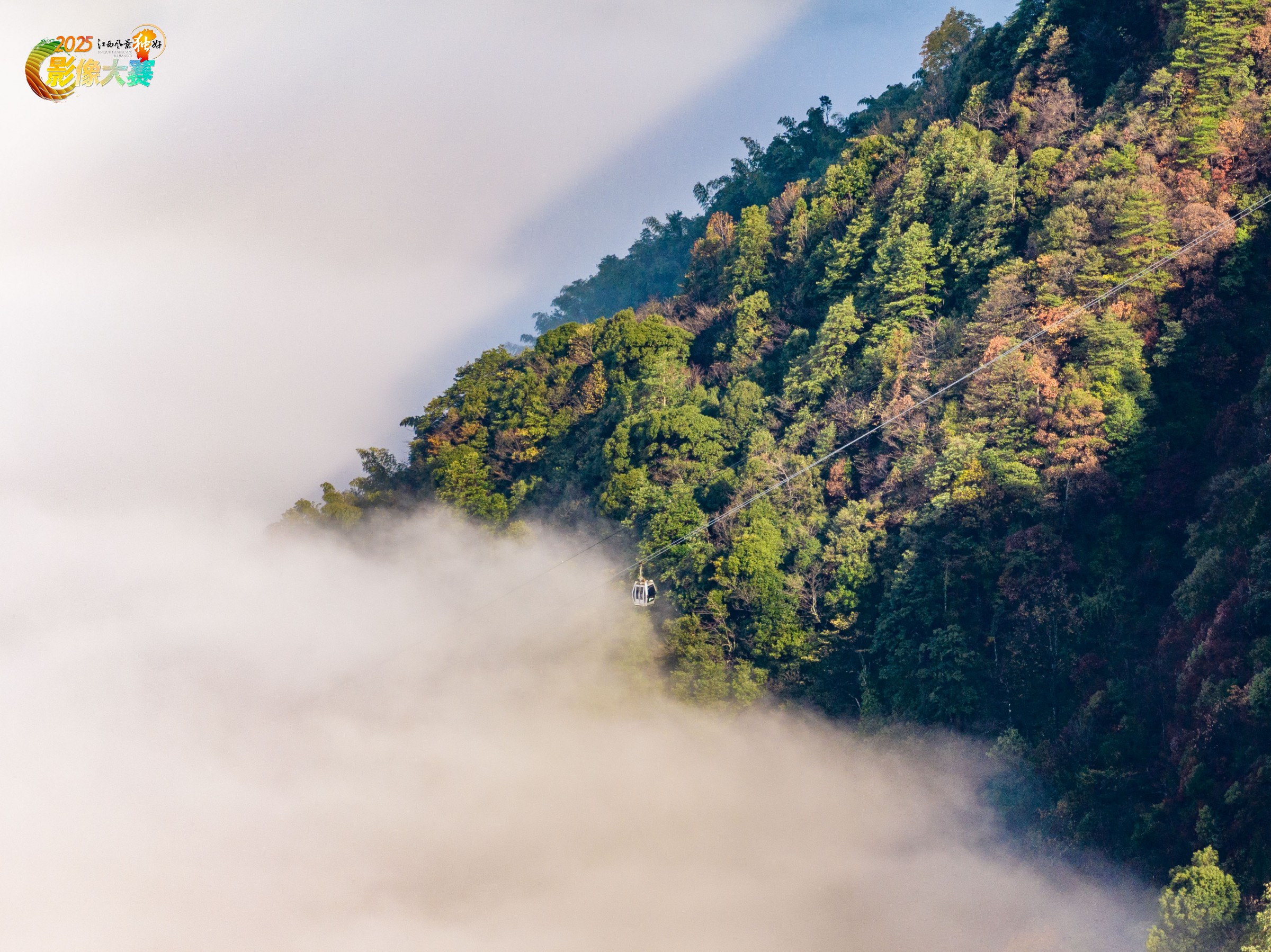 明月山秋日云海时有发生,缆车穿行云雾之中。