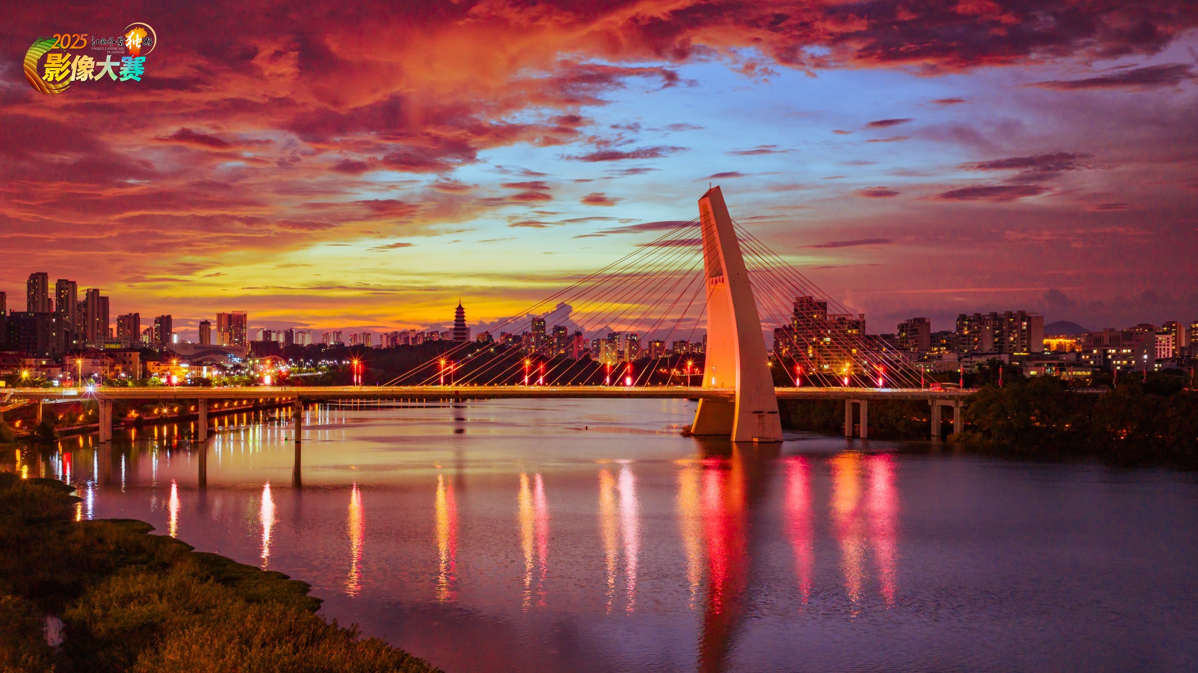 2025年9月10日傍晚落日霞光红如血色,映照在章江上的飞龙大桥,构成一幅美丽的章江美景。