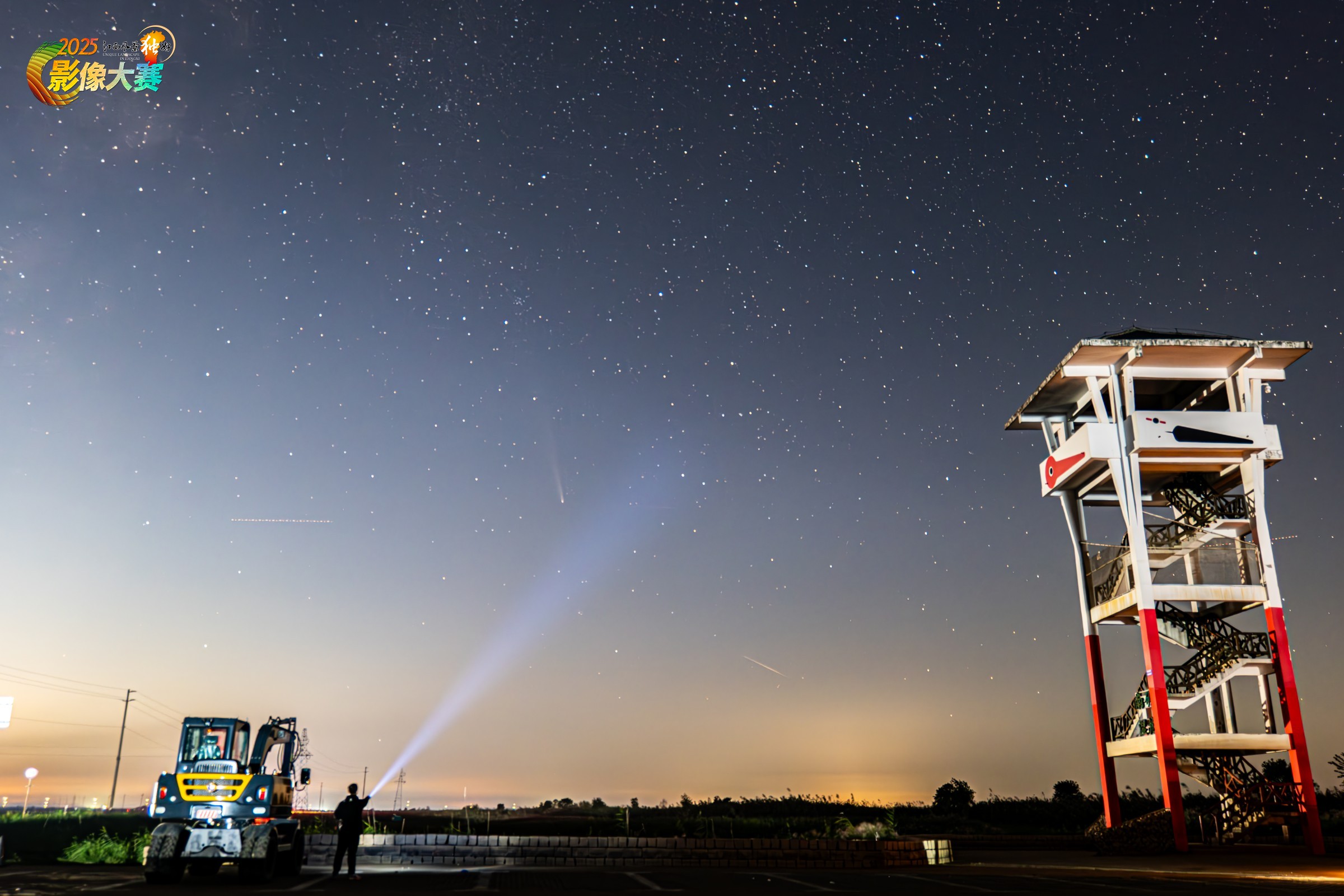 南矶山观鸟台与紫金山阿特拉斯彗星同框,紫金山阿特拉斯彗星的轨道周期是61751年,站在人类目前的文明维度来看,这一次的相遇就是人类唯一一次可以看见的机会,6万年之后,人类文明或许早就在宇宙中化作了一粒尘埃,但此刻你可以自由凝视来自宇宙的一丝辉光!