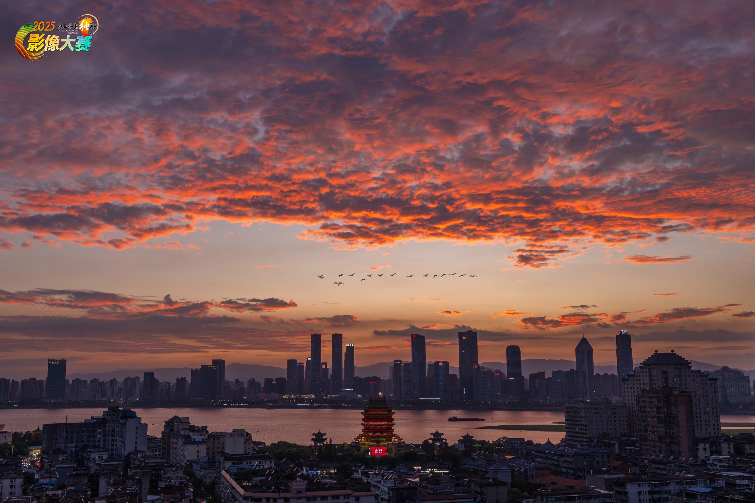 王勃《滕王阁序》中“落霞与孤鹜齐飞,秋水共长天一色。”意象的完美诠释,是千年来赣江江畔的顶级审美。