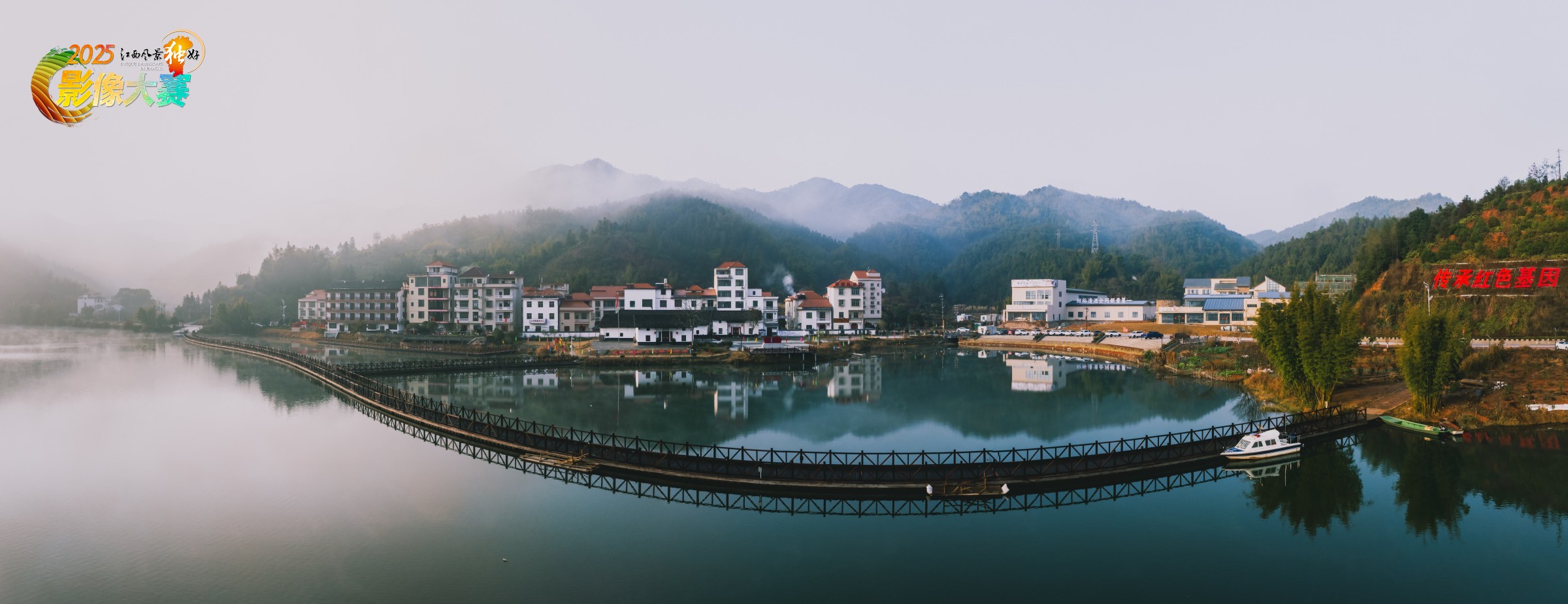 2025年2月4日拍摄于江西省赣州市上犹县东山镇南河湖。薄雾如轻纱般漫过远山,给连绵的青山披上了一层朦胧的纱衣。山脚下,一汪碧水静静流淌,水面平滑如镜,清晰地倒映着岸边错落有致的房屋。那些白墙红顶的建筑,或高或低,在晨光的轻抚下,晕染出温暖的轮廓。一座长长的桥横跨水面,桥栏的影子在水中微微晃动,与岸边的景致相映成趣。不远处,一艘小船静静地停泊着,仿佛也在沉醉于这静谧的水乡画卷之中。而山坡上“传承红色基因”的字样,又为这幅秀美的乡村图景,增添了一份厚重的历史底蕴与精神力量。