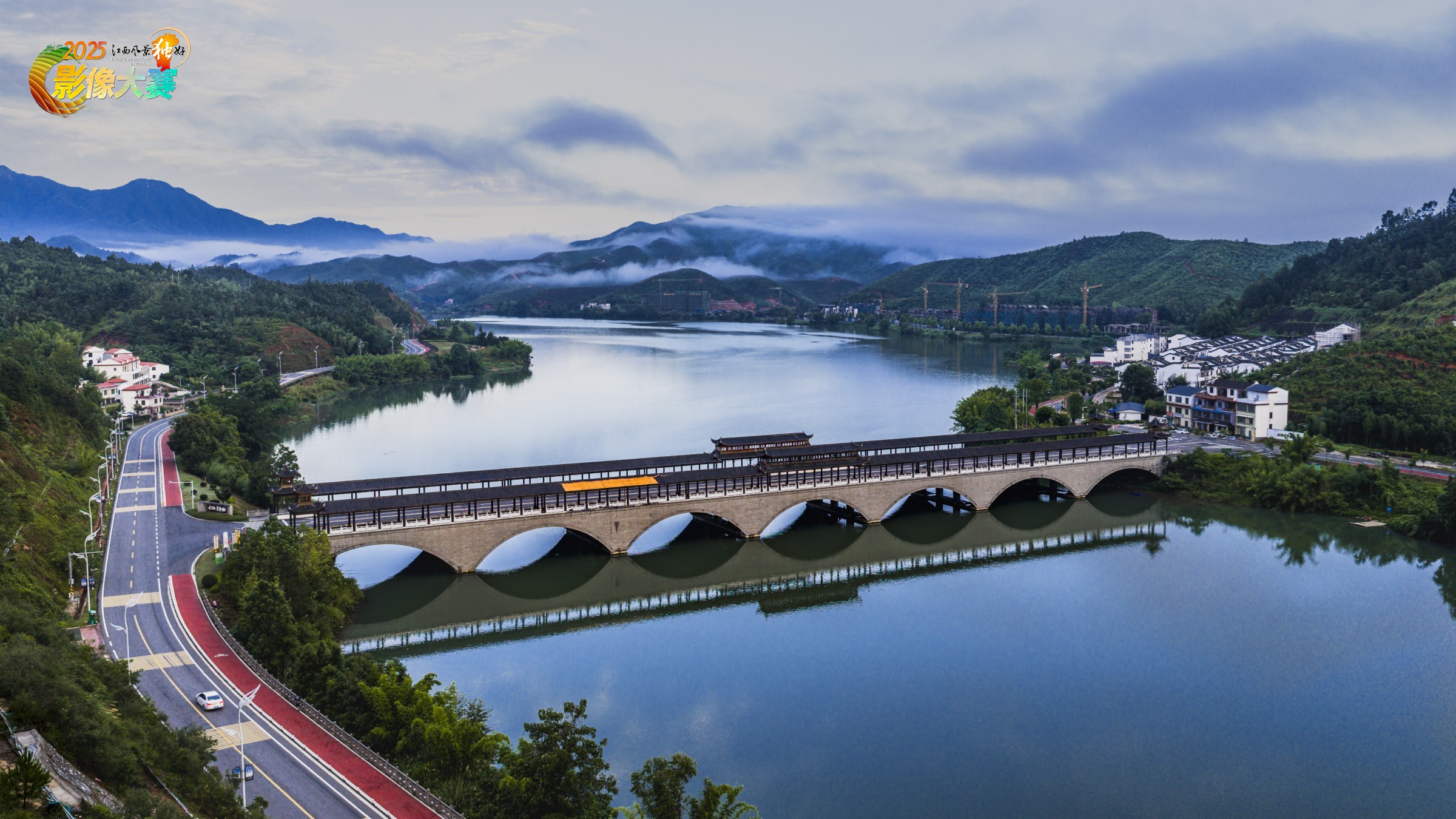 《烟雨南湖》作品,2025年8月3日拍摄于江西省赣州市上犹县东山镇。青山环抱间,湖水如镜。廊桥横跨碧波,连起两岸烟火。远处云雾缠山峦,近旁村舍映水光,公路蜿蜒,把自然的静美与生活的温度,悄然编织进这幅山水长卷 。