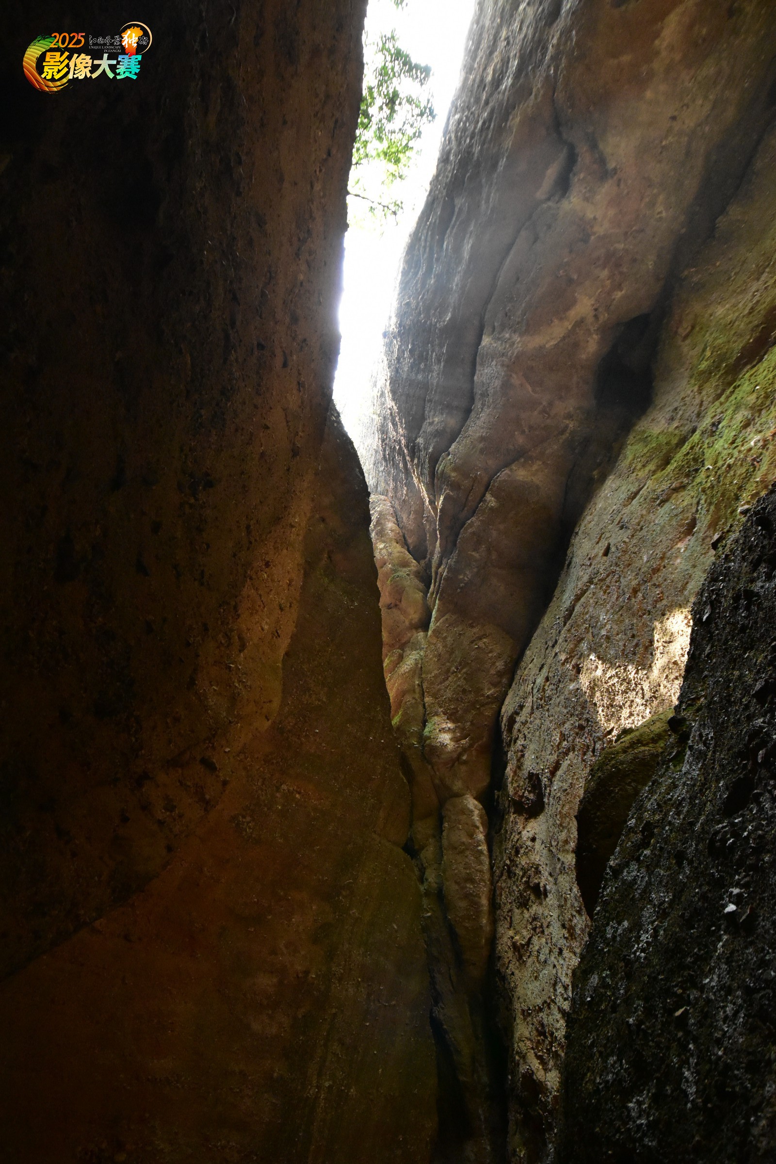 丹霞山体发育巨大垂直节理,在水流的长期冲刷溶蚀作用和伴生的重力崩塌作用下,会逐渐变深变宽。当水流的下蚀作用强度超过侧蚀作用速度时,可形成深度远远大于宽度且谷壁嶙峋的沟谷,称为嶂谷。嶂谷将山体两侧切穿时又称为一线天,从下部岩洞中仰头可见到一条线状的通天空洞,故名。