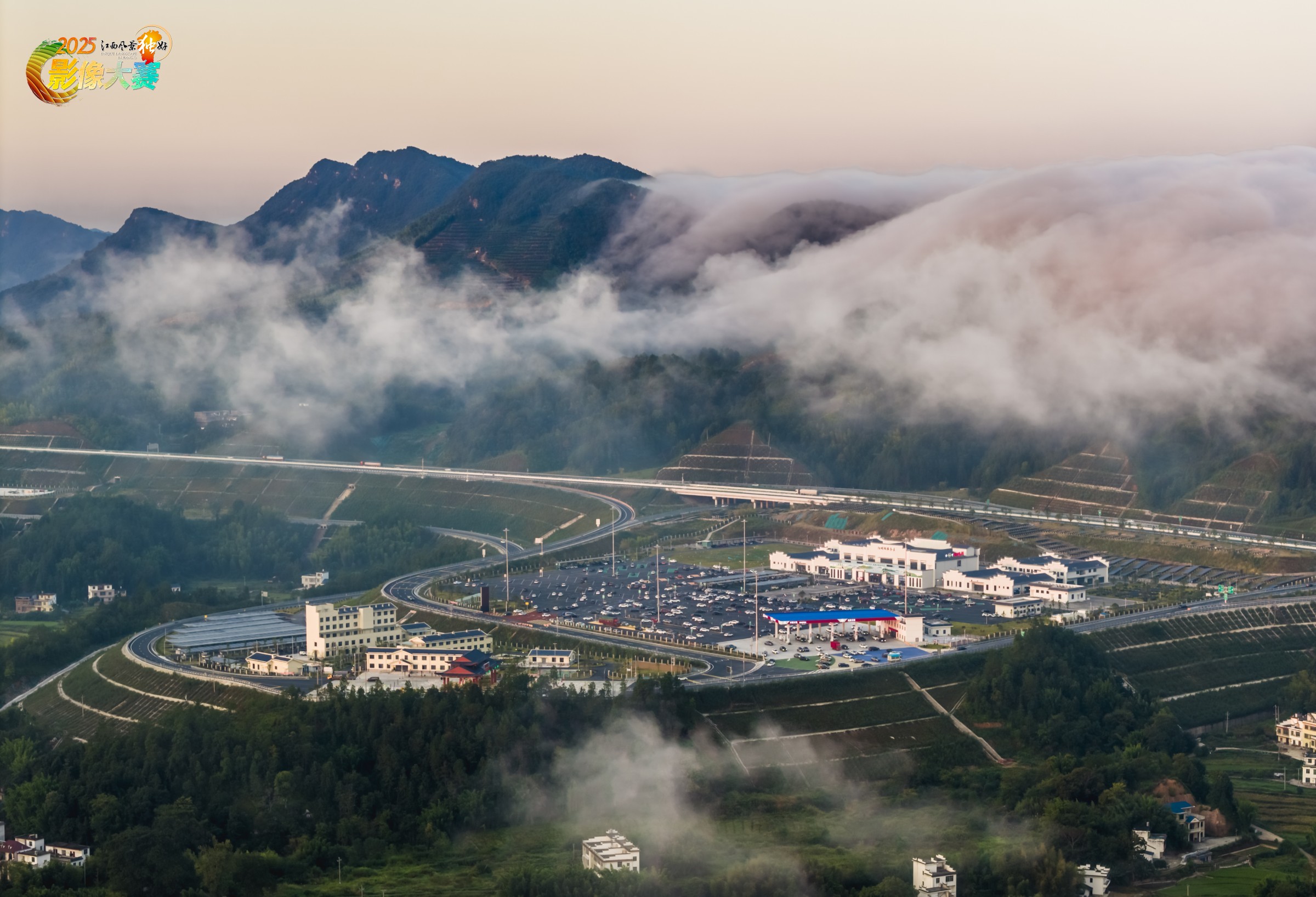 《交通盛景图》作品,2025年10月8日拍摄于江西省赣州市上犹县,图为遂大高速阳明湖服务区。云海翻涌间,群山如黛,公路蜿蜒若银带穿梭。驿站建筑在云雾与绿意中舒展,现代交通的活力与山野的静谧在此交融,绘就一幅灵动的山间枢纽图景,满是自然与人文的和谐韵致。