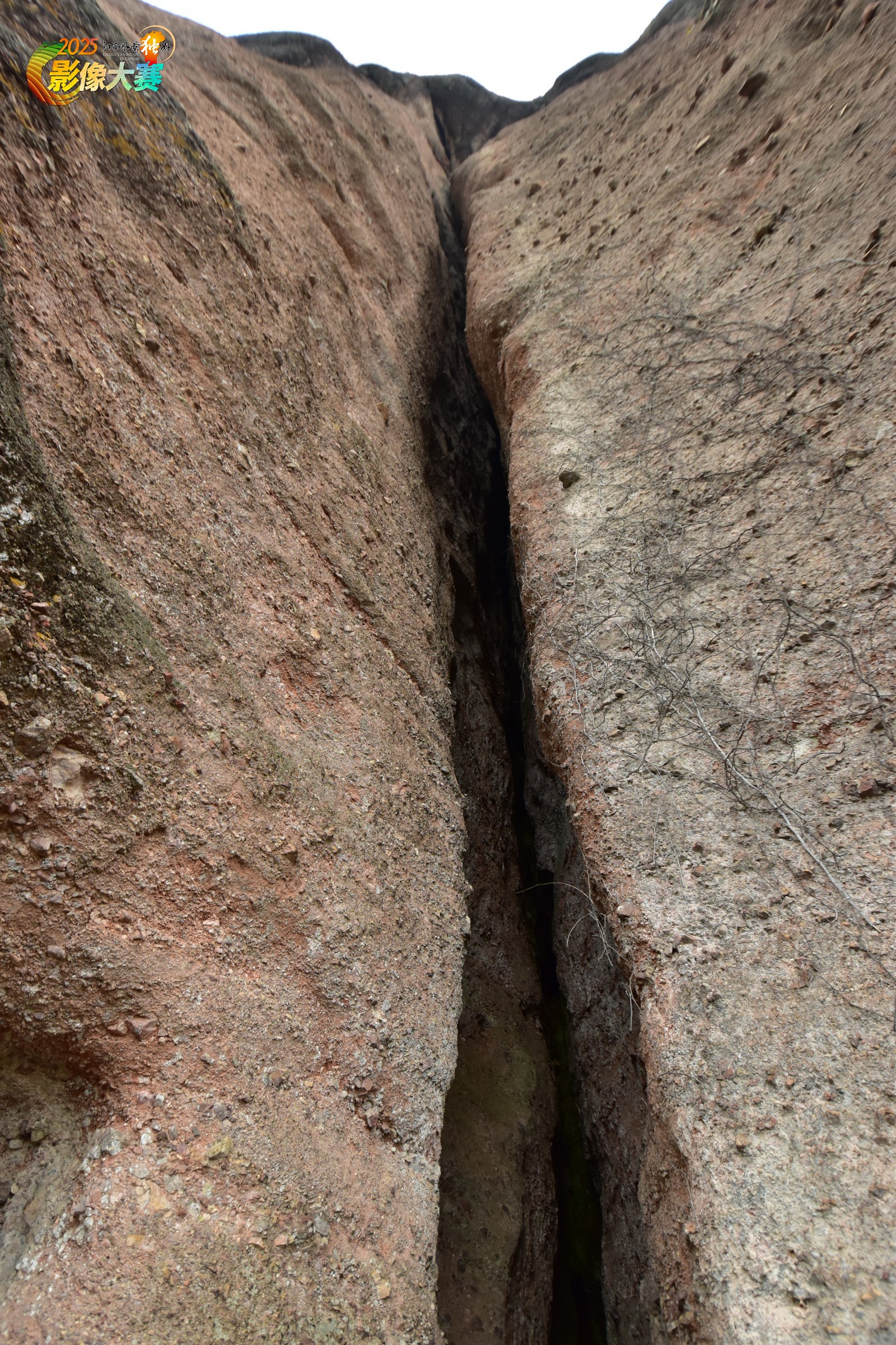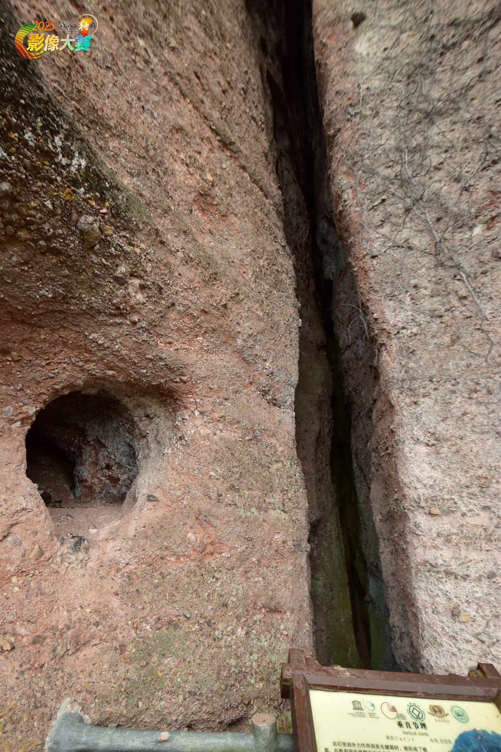 岩石受到外力作用而发生破裂时,就形成了破裂。在断裂面的两侧岩石没有发生相对位移时,称为节理。节理面与水平面相垂直者,又称垂直节理。沿着节理面,经流水冲刷侵蚀后会形成较大裂隙。龙虎山正是由于在原始山体中发育了大量不同方向的垂直节理、裂隙,才使得后期的流水冲刷、风化剥蚀和崩塌后退作用得以进行,从而形成了千姿百态的丹霞地貌景观。