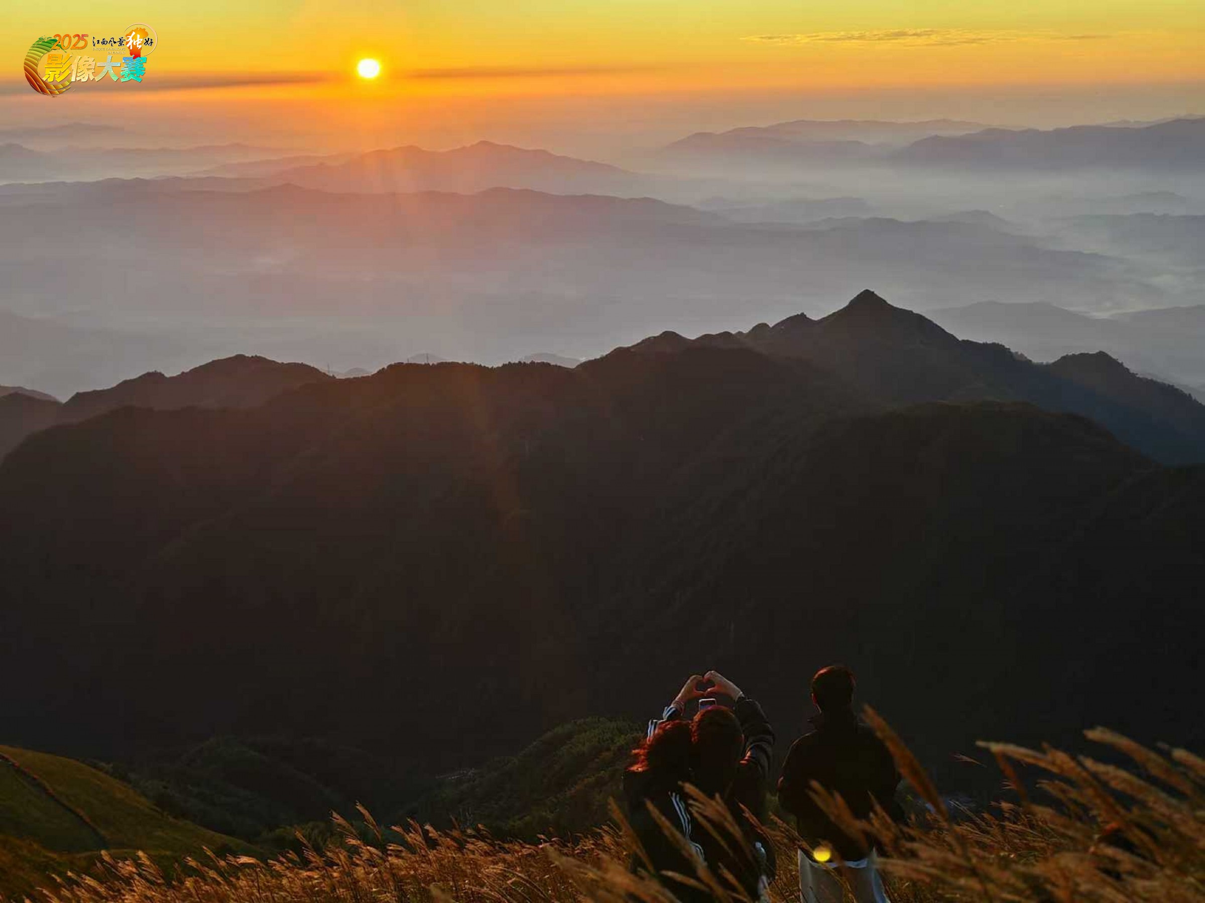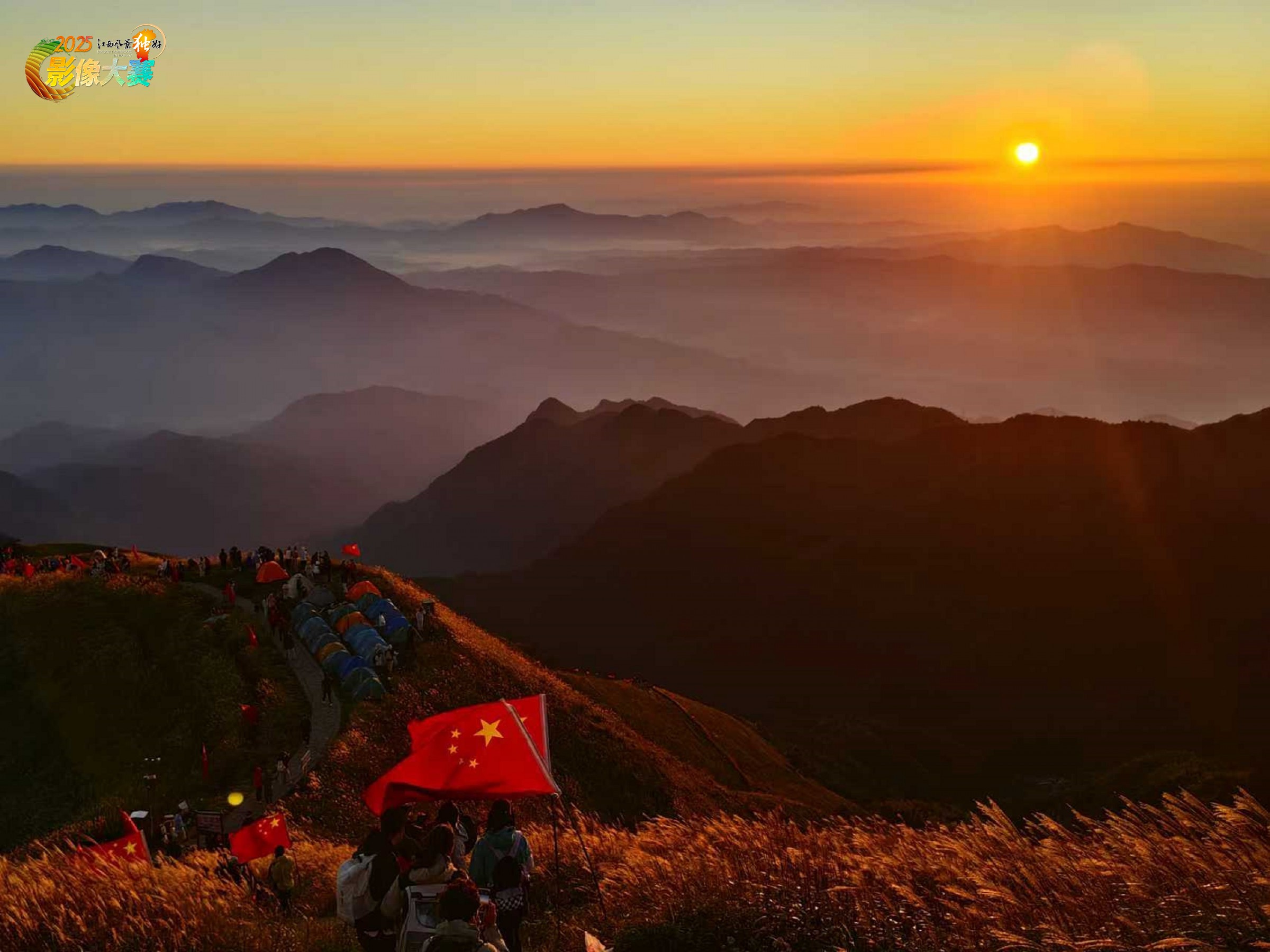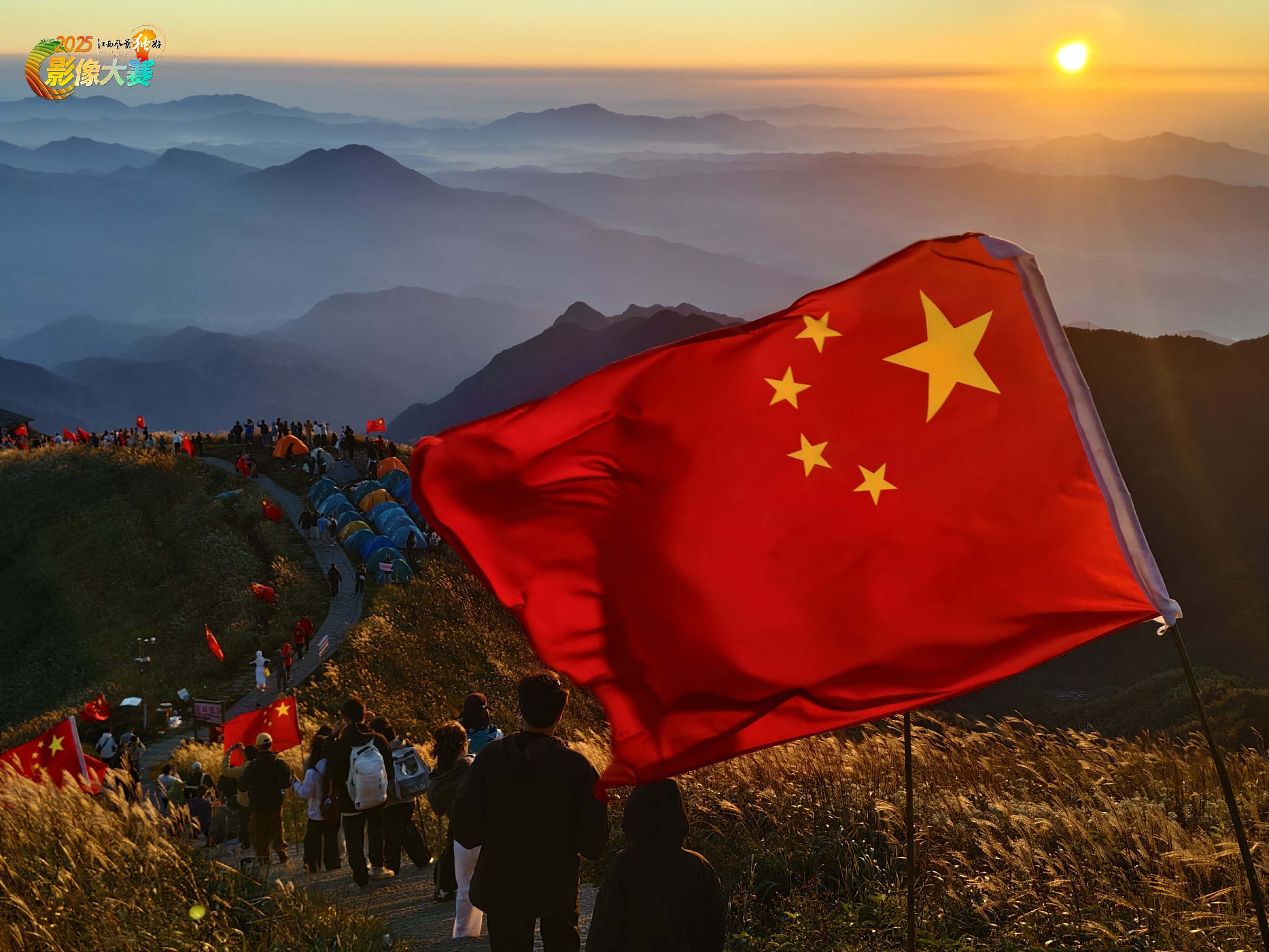 这组图的名字叫做《山河朝晖》,“晖”,既是指日出,亦代表希望。拍摄这组照片时正值晨光破晓,武功山巅的云海被染成鎏金,层峦叠嶂霞光漫卷中舒展画卷 —— 这抹从天际漫开的光亮,是自然馈赠的诗意,更是时代奔涌的希望。山巅之上,红旗猎猎作响,鲜红的旗帜与朝阳交相辉映,既是游人对祖国的赤诚告白,也为壮阔山河添了最动人的 “中国红”。 驻足的人们举着相机定格美景,孩童在草甸上追着光奔跑,老人望着红旗与日出轻声感慨…… 这些鲜活的身影,藏着新时代美好生活的模样:我们既能奔赴山川湖海,拥抱自然之美;也能以红旗为证,传递家国情怀。当朝晖洒满肩头,当红旗映亮笑脸,便知这 “山河无恙、人间安康” 的图景,正是时代赋予我们的稳稳幸福,也是向着更美好未来前行的无限希望。