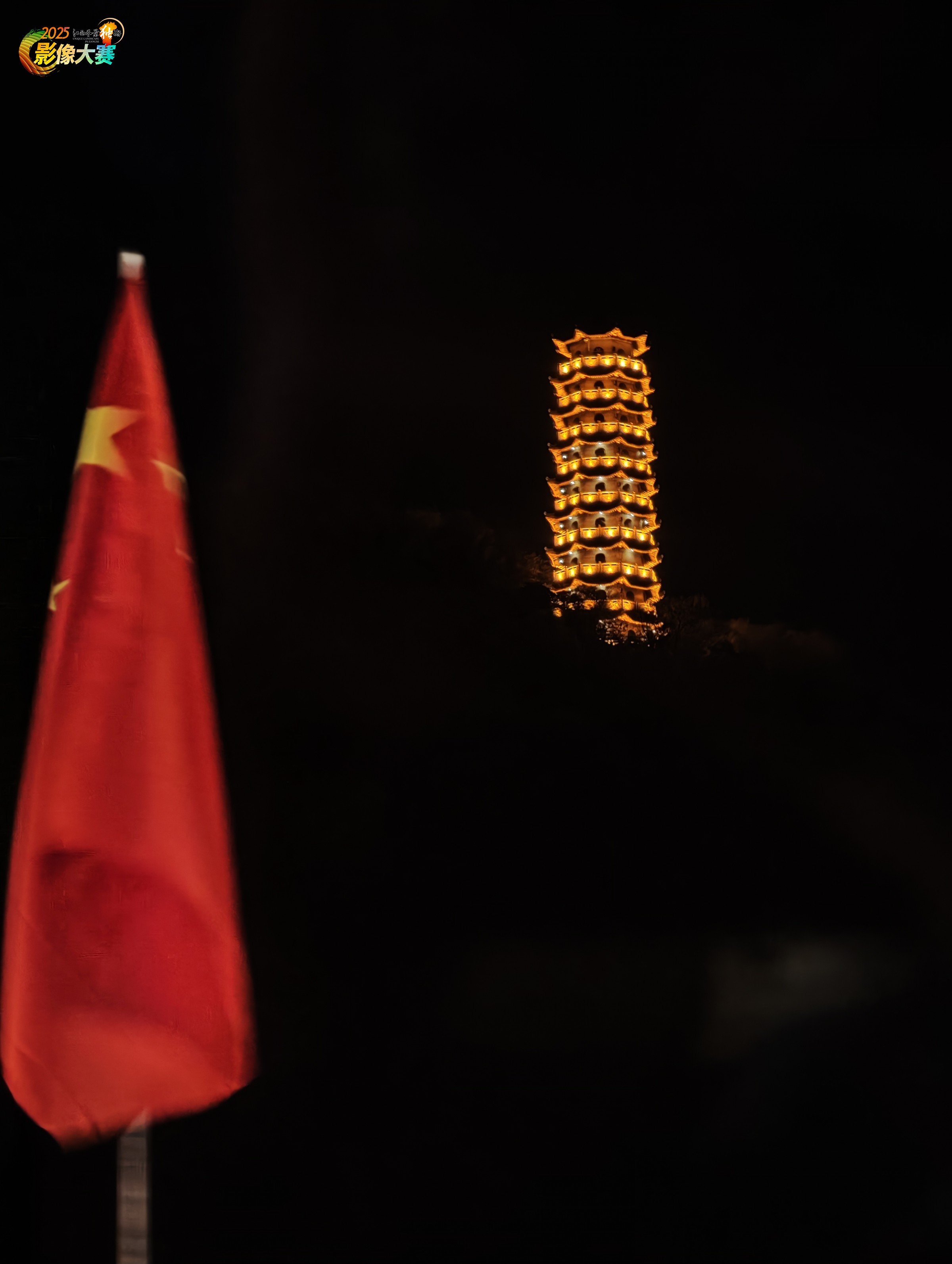 远方塔里的光,近处是鲜艳的国旗,永不褪色的是我们的记忆,在黑暗处闪闪发光