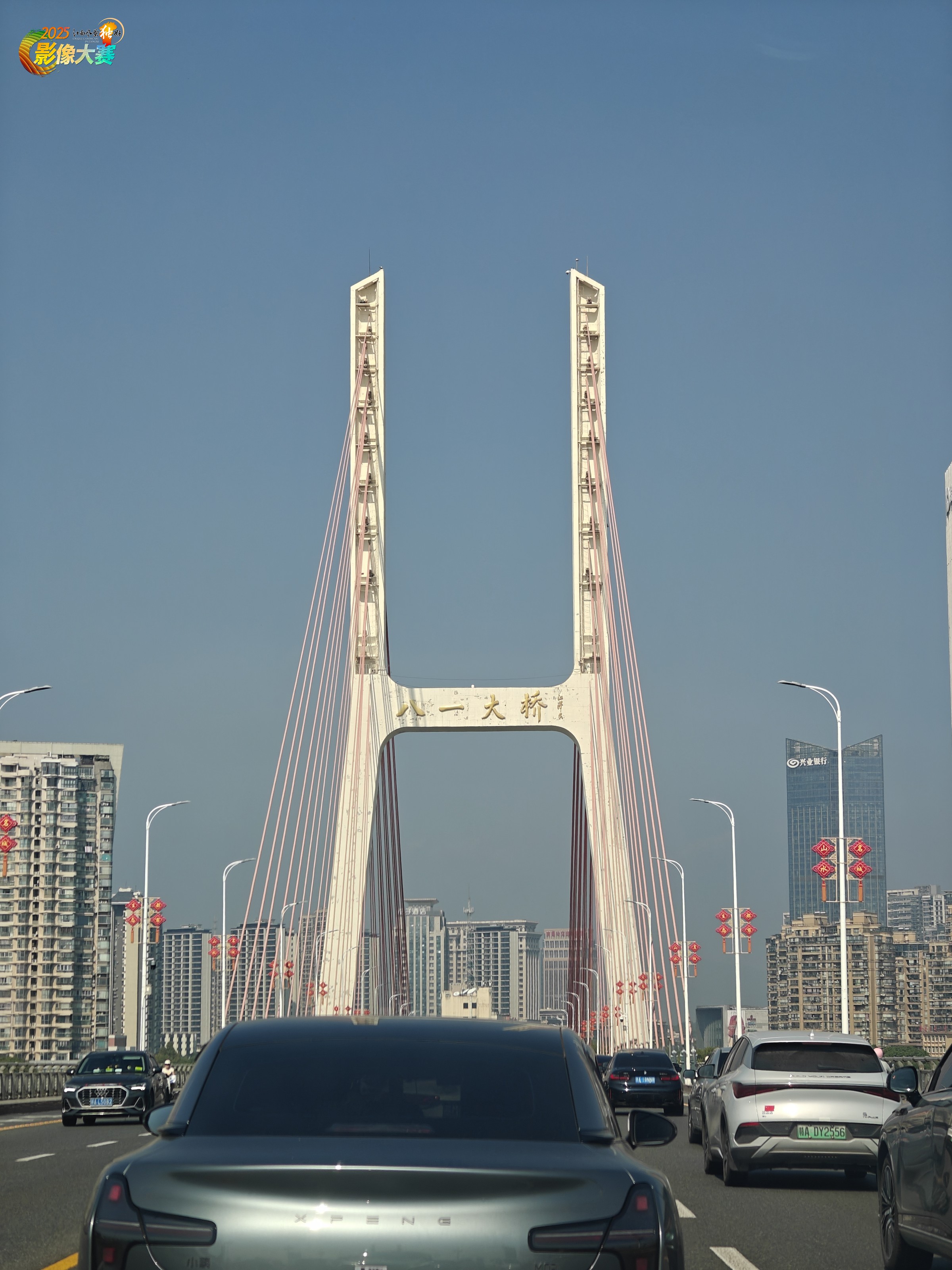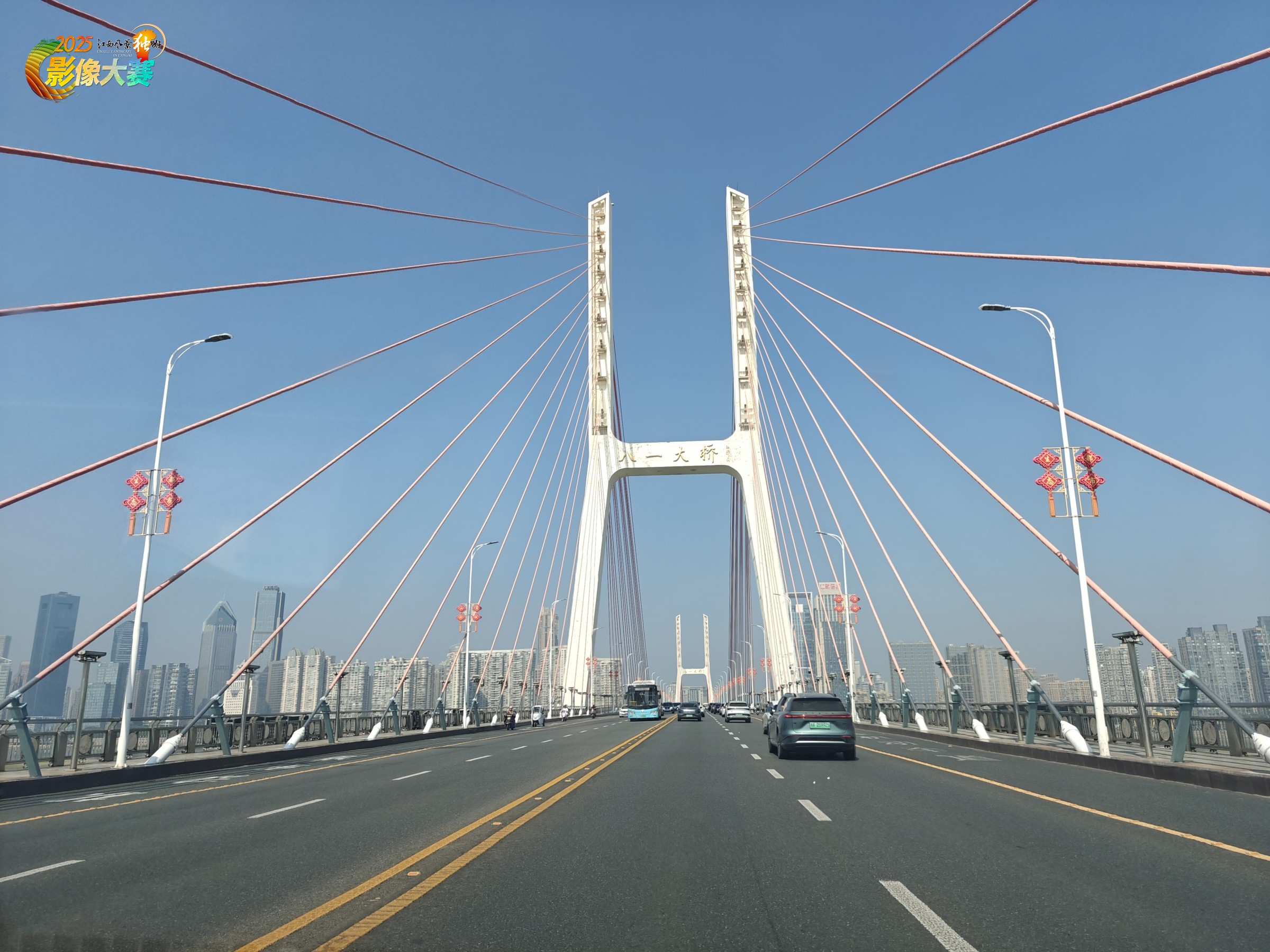 2025.10.05,国庆节假期,在返程的途中,在打车的副驾驶座抓拍的,英雄城地标:八一大桥、绿地双子塔、南昌之星摩天轮。