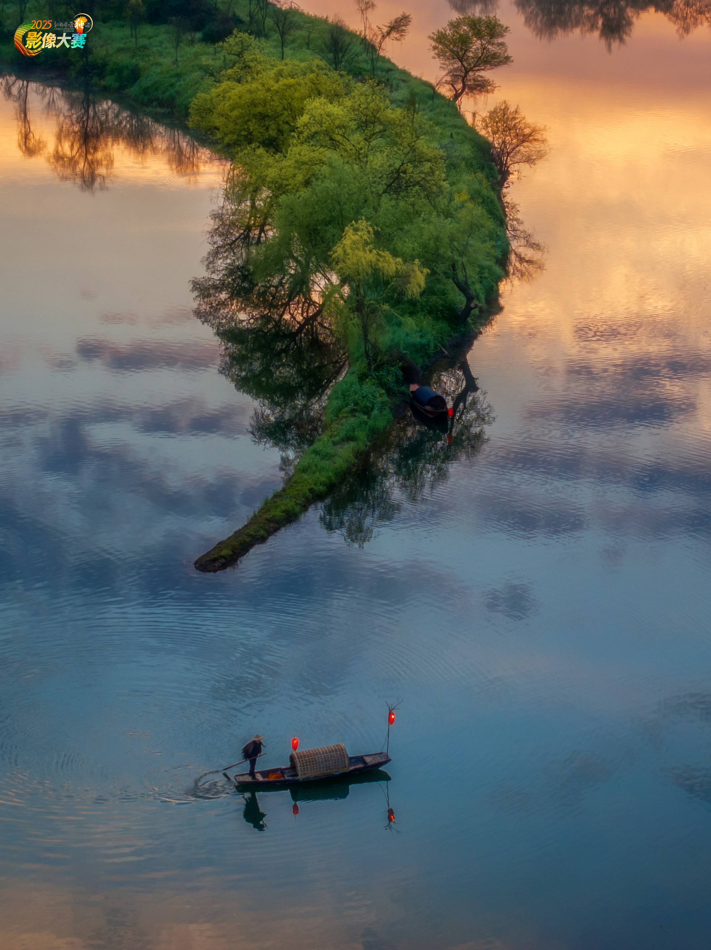 清晨,婺源月亮湾的水面上,渔舟在熹微晨光里缓缓穿行,岸边绿树与远山在初阳下晕染出柔和的色彩,一幅灵动的水乡晨韵图徐徐展开。