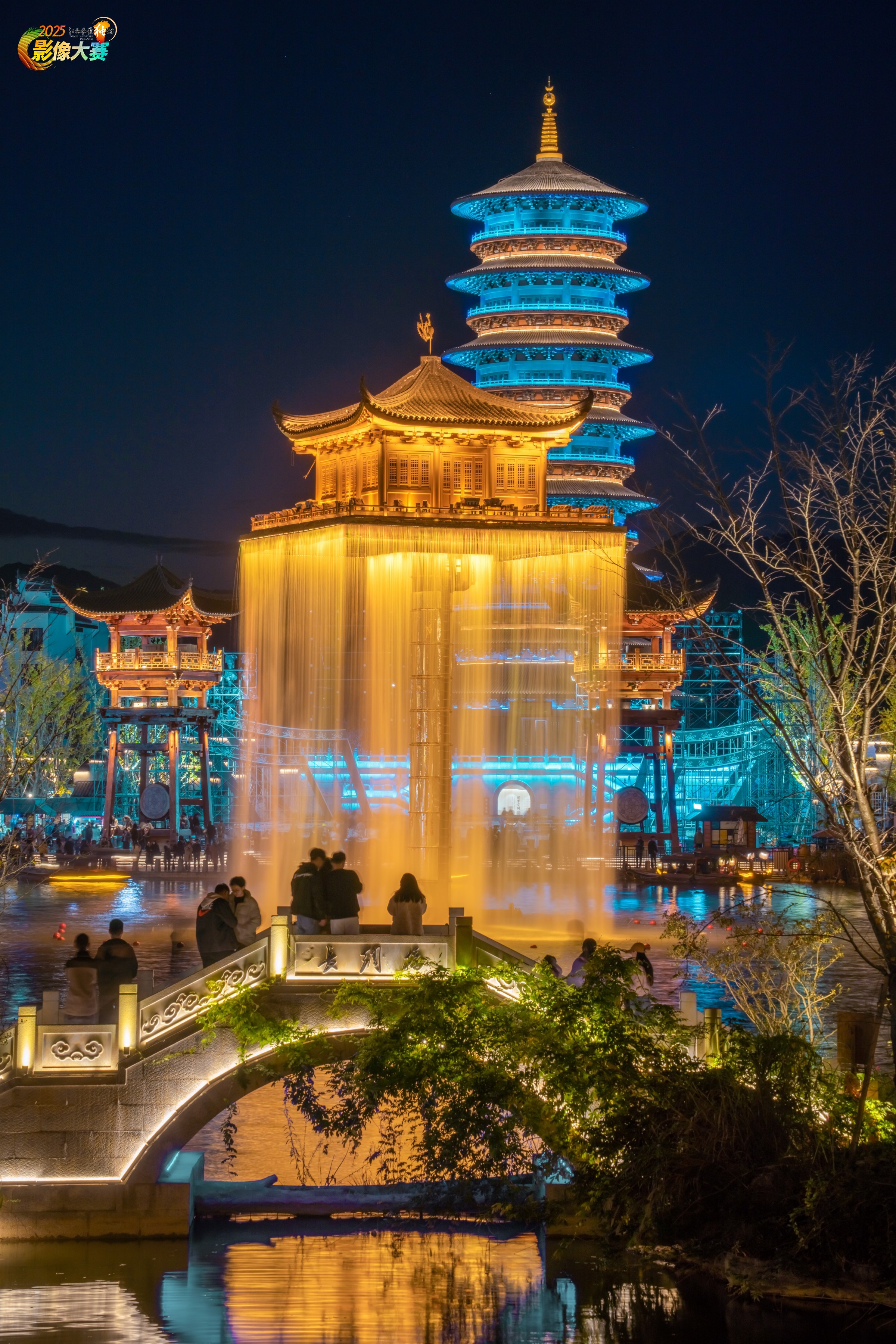 “夜塔” 点明夜晚的塔,“流光” 突出塔及周边建筑灯光流动、绚烂的效果,展现出夜晚塔在灯光映照下光彩夺目的景象。