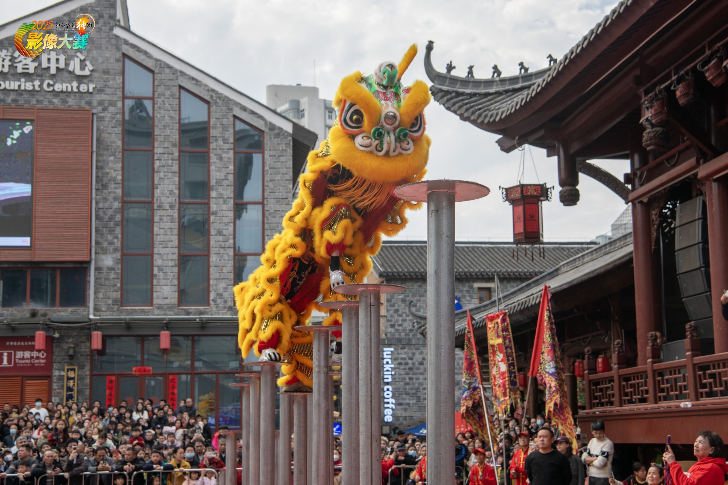 2025年1月30日,江西省南昌市万寿宫历史文化街区,游客在观看舞狮表演。