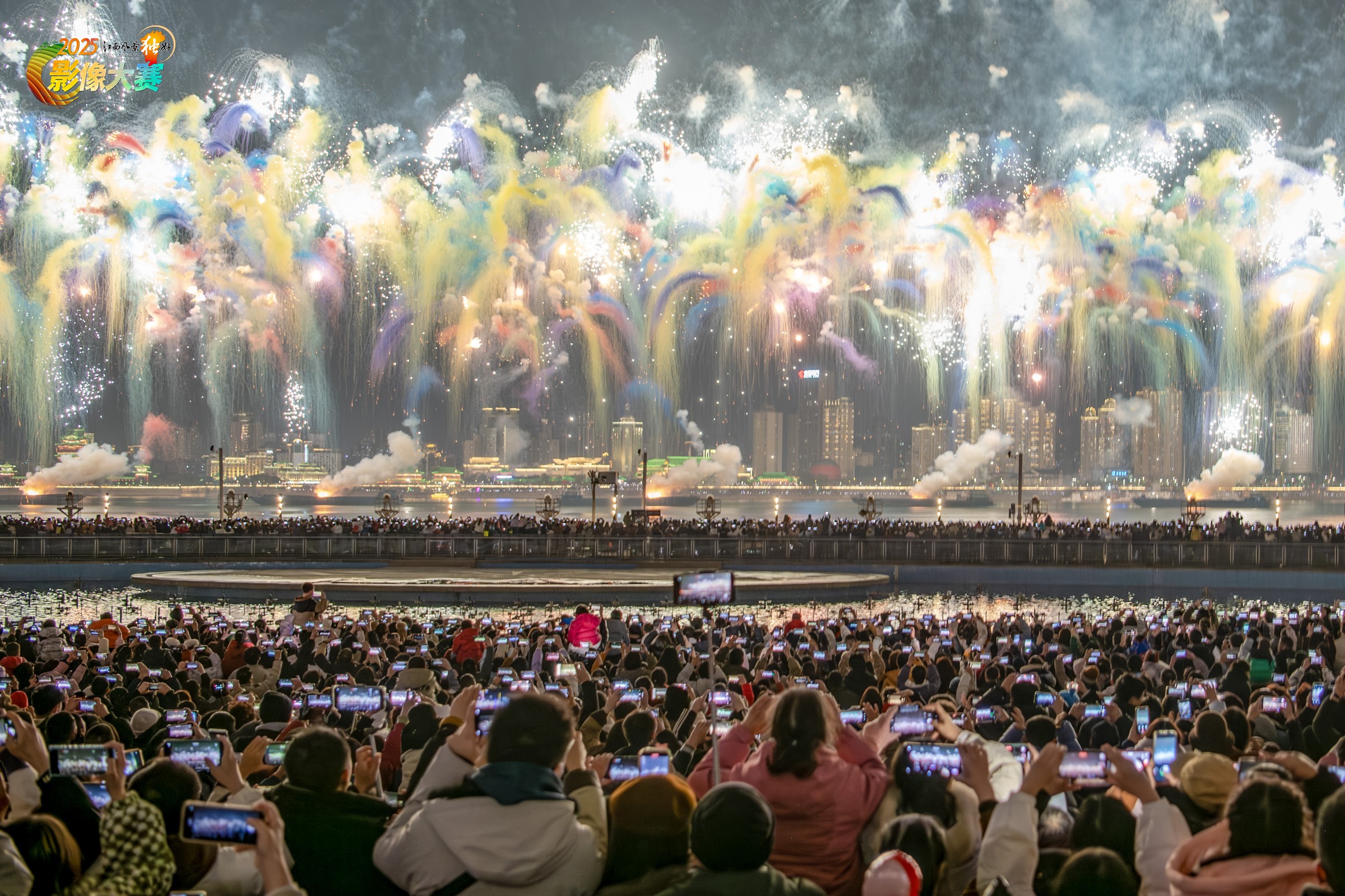 2025年1月29日(农历大年初一)晚上8时,游客和市民在江西省南昌市观看“豫章春色 人间烟火”2025年南昌市迎春烟花晚会。