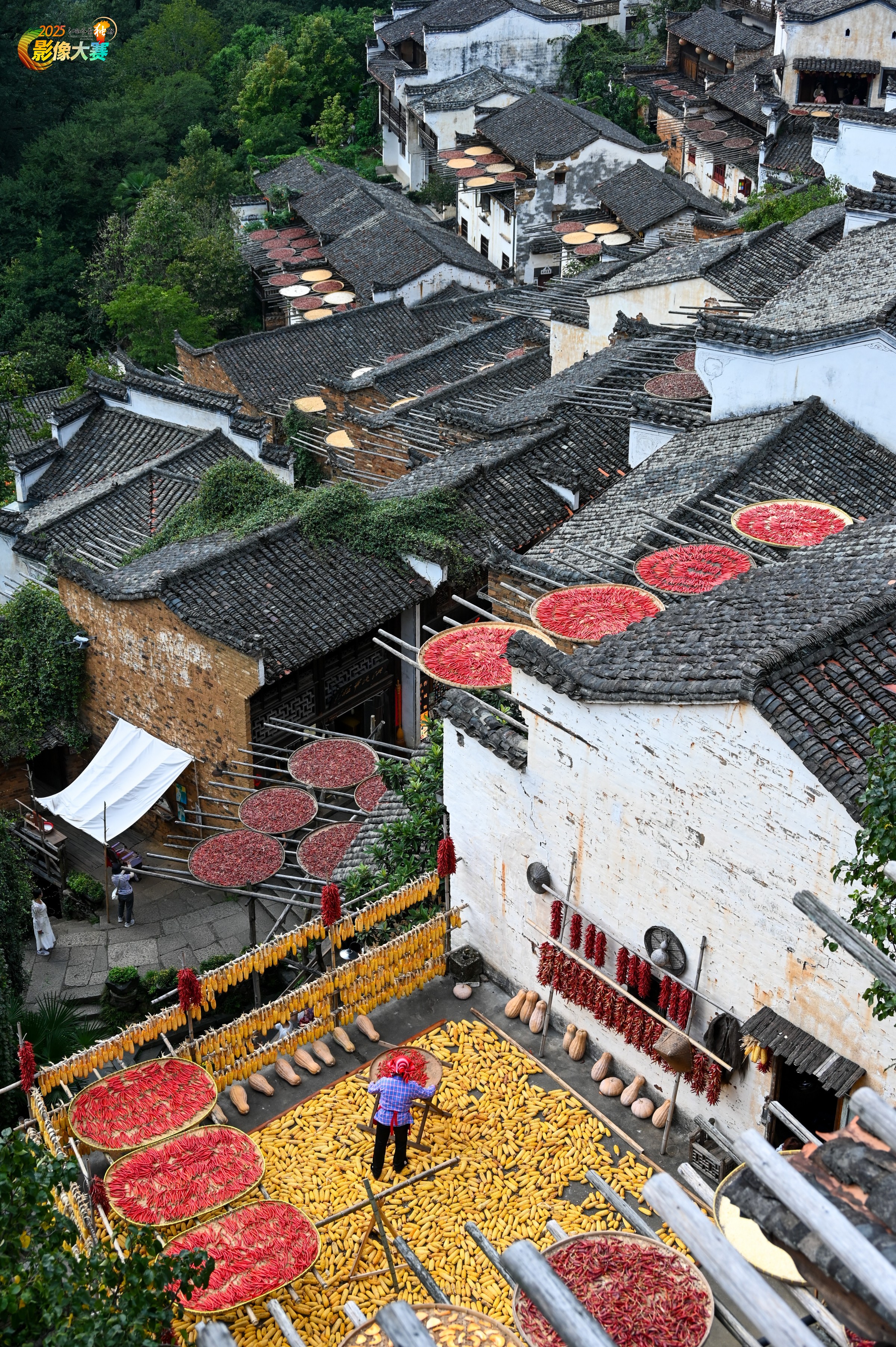 这幅摄影作品生动记录了江西篁岭秋收时节的烟火气。白墙黛瓦的徽派民居层层叠叠,屋顶、院落铺满金灿灿的玉米和红艳艳的辣椒,像打翻的调色盘般绚烂。画面中央,身着蓝布衫的农妇正弯腰整理辣椒串,竹筛里鲜红的果实与灰瓦形成强烈对比。远处青山如黛,近处晒匾错落,俯拍视角将建筑肌理与农作物图案完美融合,既有几何美感,又充满生活温度。整幅作品通过明快的色彩碰撞(玉米黄、辣椒红、屋檐黑、墙面白),传递出"五谷丰登"的喜悦,更展现了当地人"晴晒秋收"的传统智慧。那些挂在墙上的辣椒串,既是食物储备,也成了最朴实的装饰艺术。