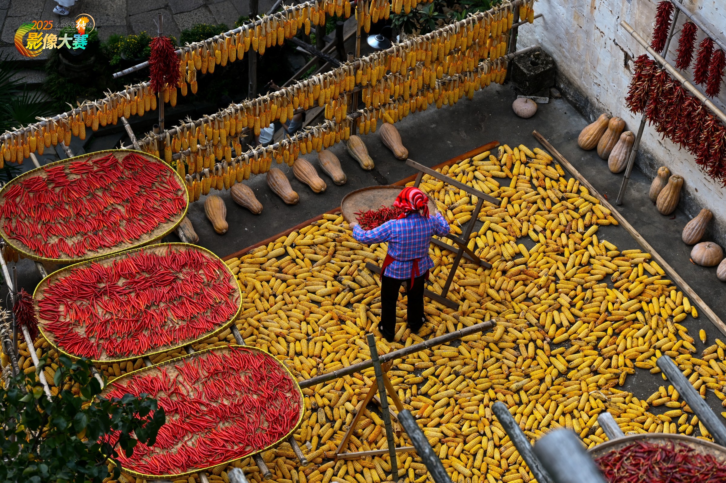 画面中,红头巾农妇弓身整理辣椒的姿态成为点睛之笔,她手中鲜红的辣椒与满地金黄的玉米形成冷暖色调的激情碰撞。建筑元素被巧妙转化为画布——白墙上的辣椒串如音符般垂挂,黛瓦间的玉米棒排列出韵律感,晾晒的农作物在灰白底色上泼洒出最浓烈的秋意。