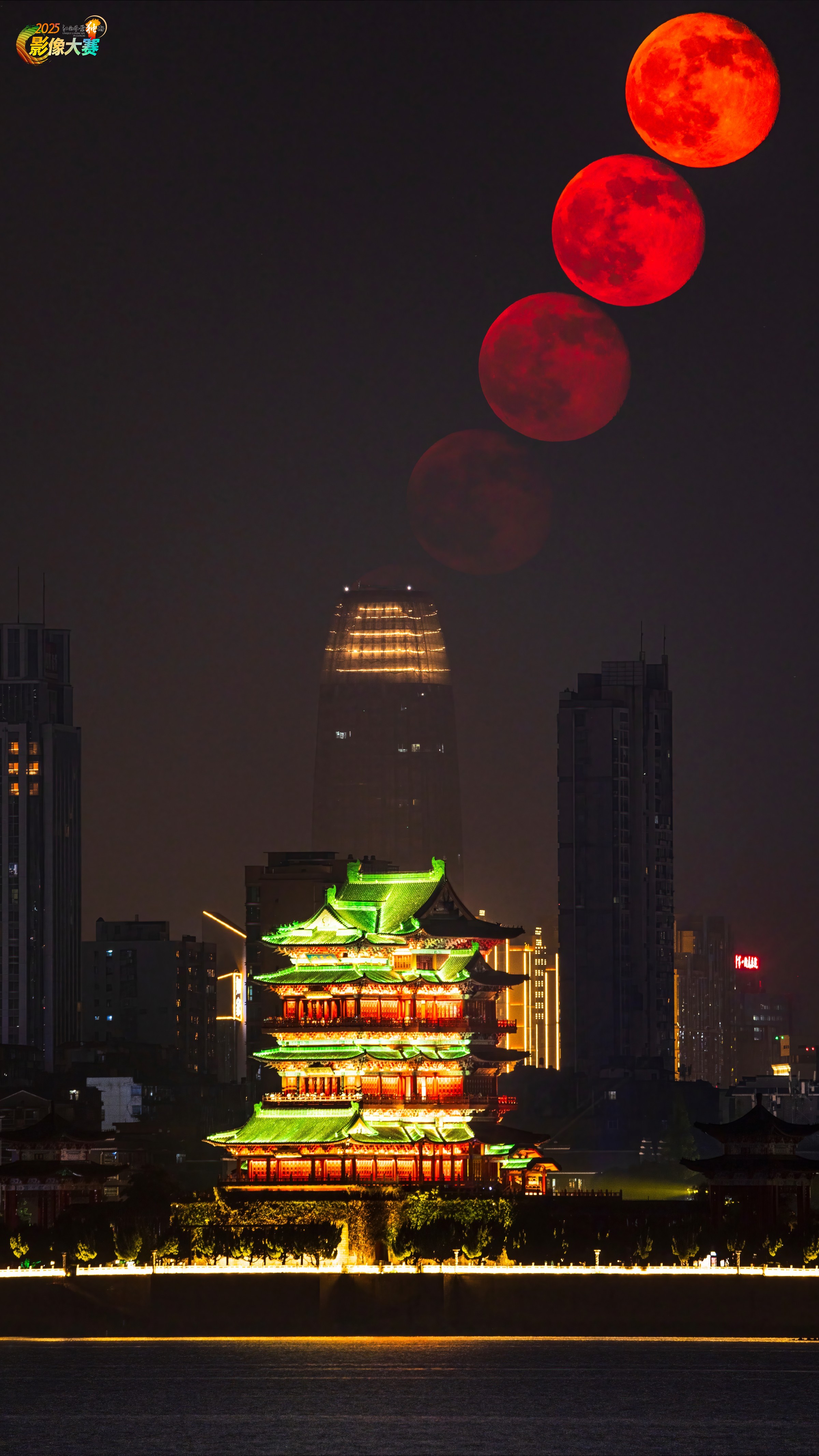 组图聚焦江南名楼滕王阁,以古阁为轴,织就一幅天地万象图:青瓦飞檐吻新月,朱墙画栋沐落晖,红月叠影悬檐角,更有彗星曳光掠阁檐。既藏《滕王阁序》“天高地迥”的壮阔,又让古建与日、月、彗星等天象共生,在现代都市的天际线间,让千年名楼成为连接天地时序与古今文明的坐标,是自然奇景与人文瑰宝的诗意碰撞。