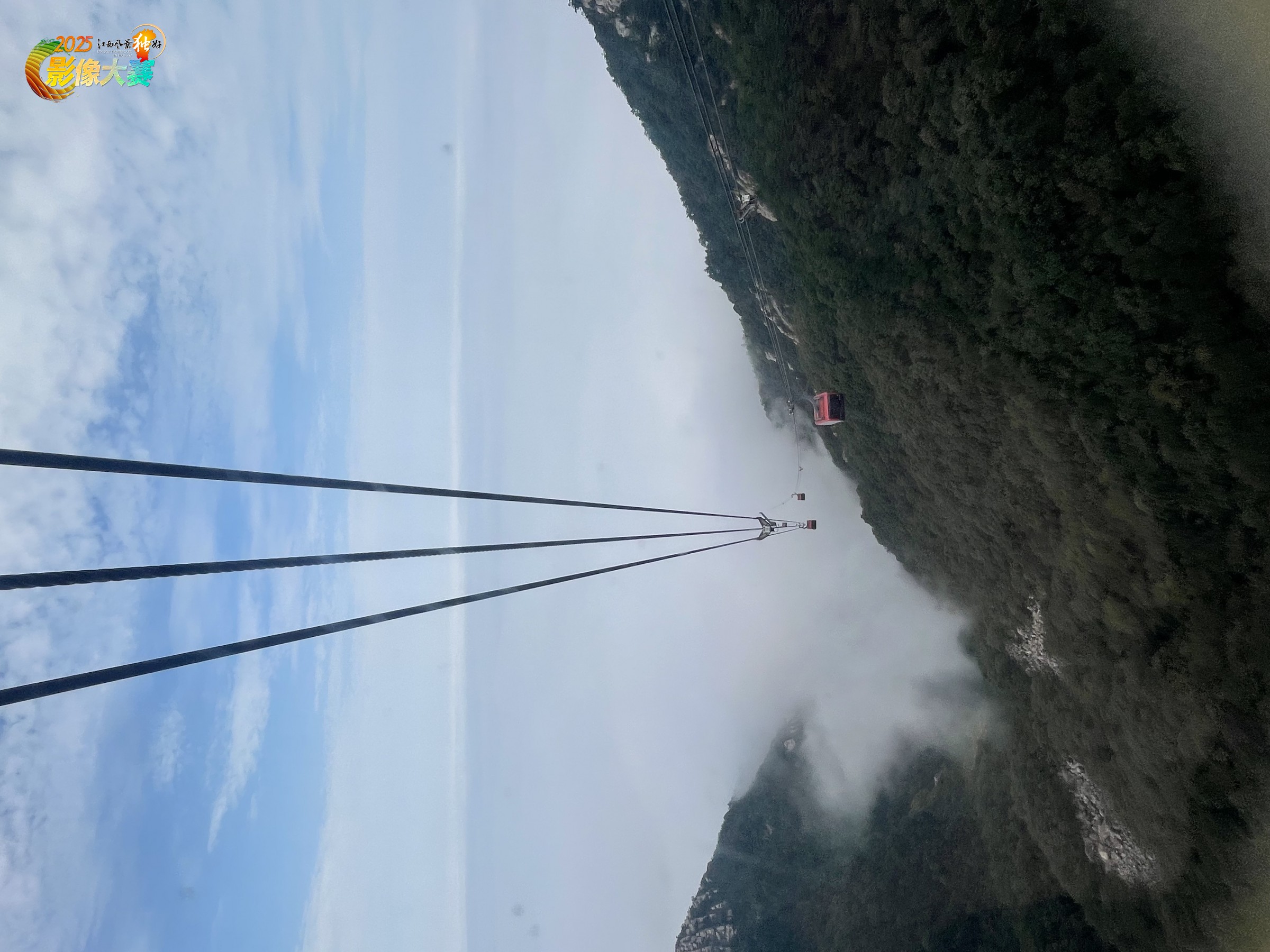 缆车穿云破雾,两旁山势凛冽,豁然开朗