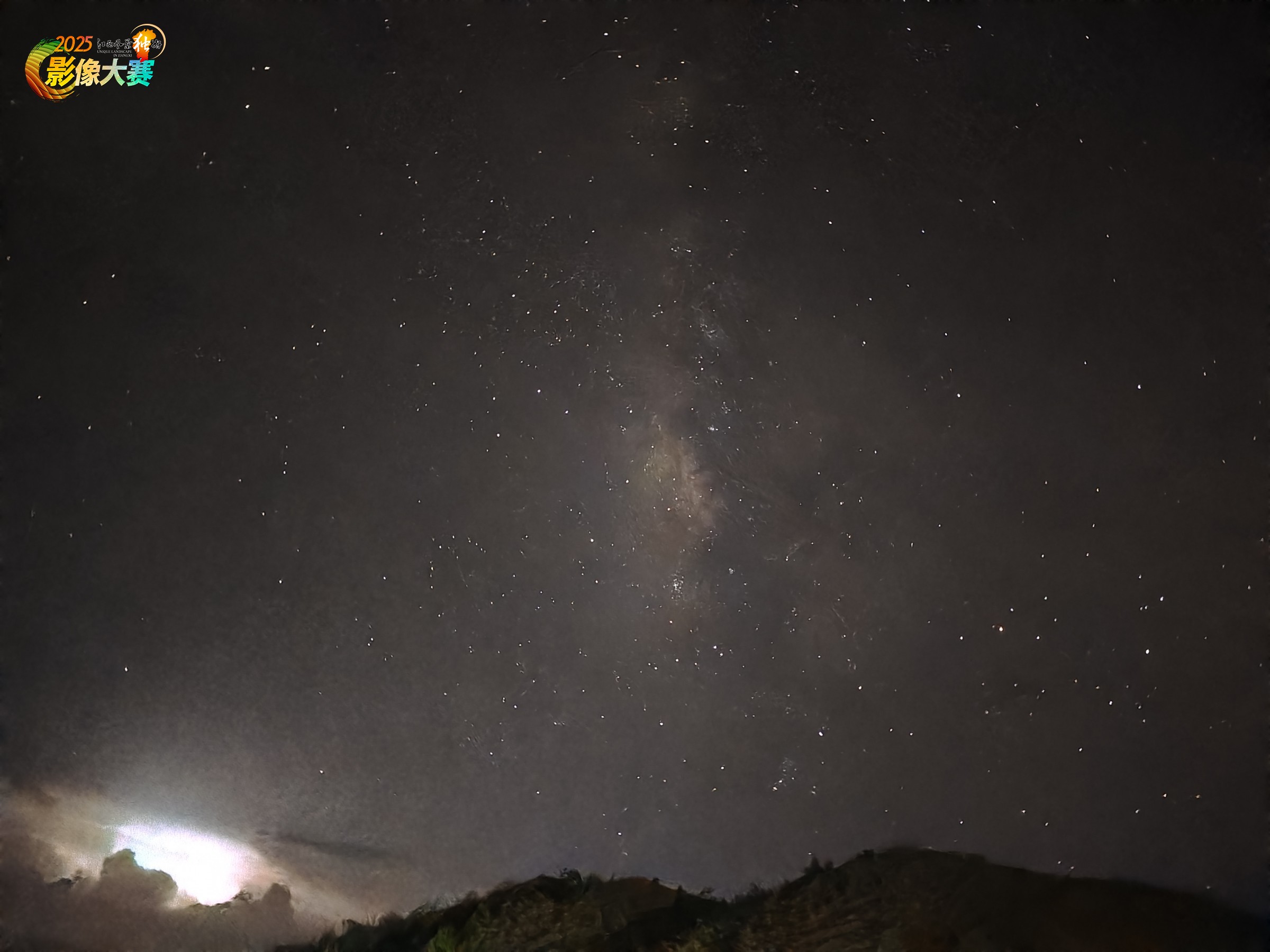 画面中间拍到了银河,天蝎座与人马座茶壶,左下角是远处的闪电,下方是山丘。整张画面看上去很奇妙,却也很和谐,江西乡下的星空真的很美。