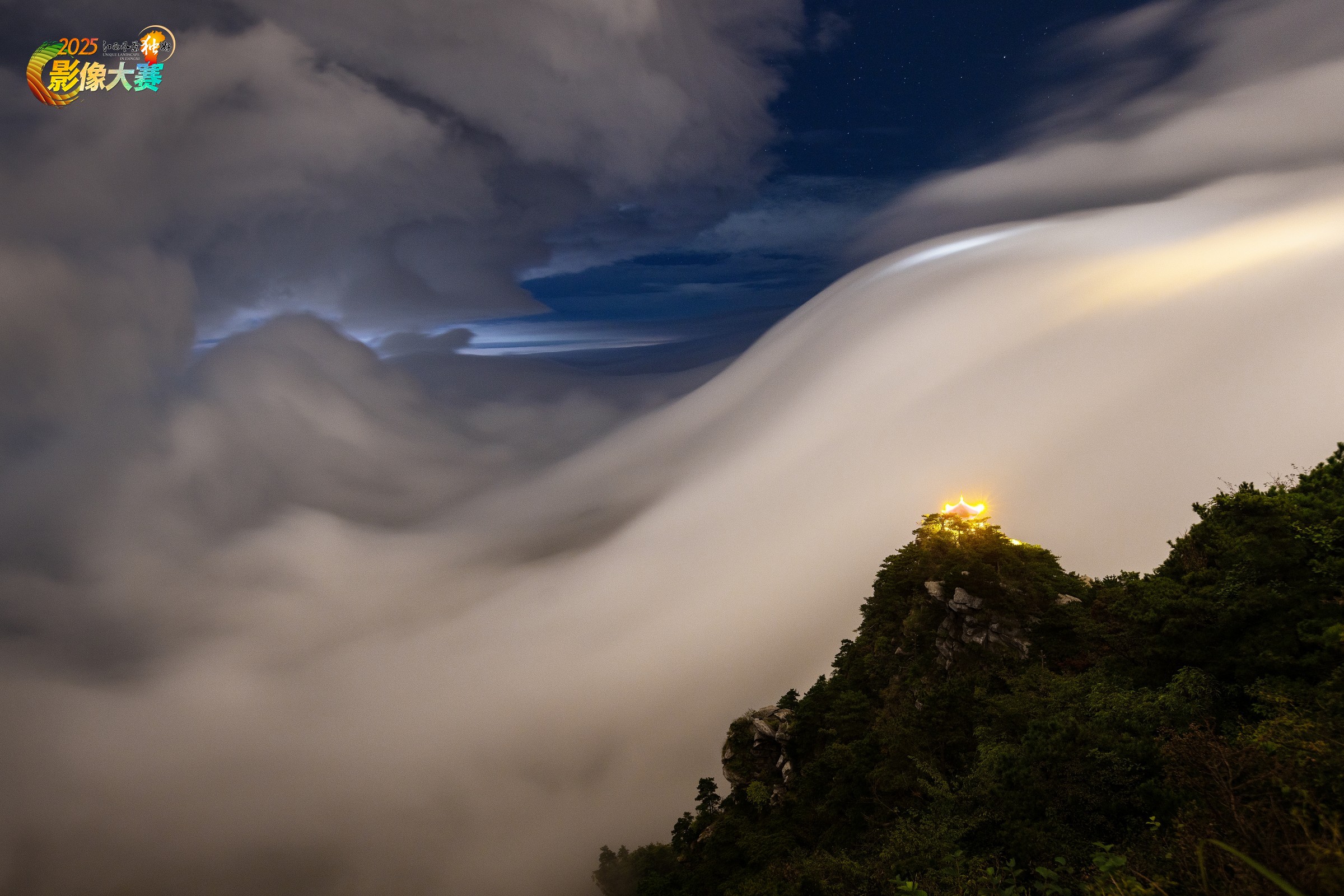 夜幕垂落,瀑布云化作长卷,自峰顶倾泻而下,如银河倒悬,乳白雾霭裹挟星光流淌,在幽谷间翻涌成浪。