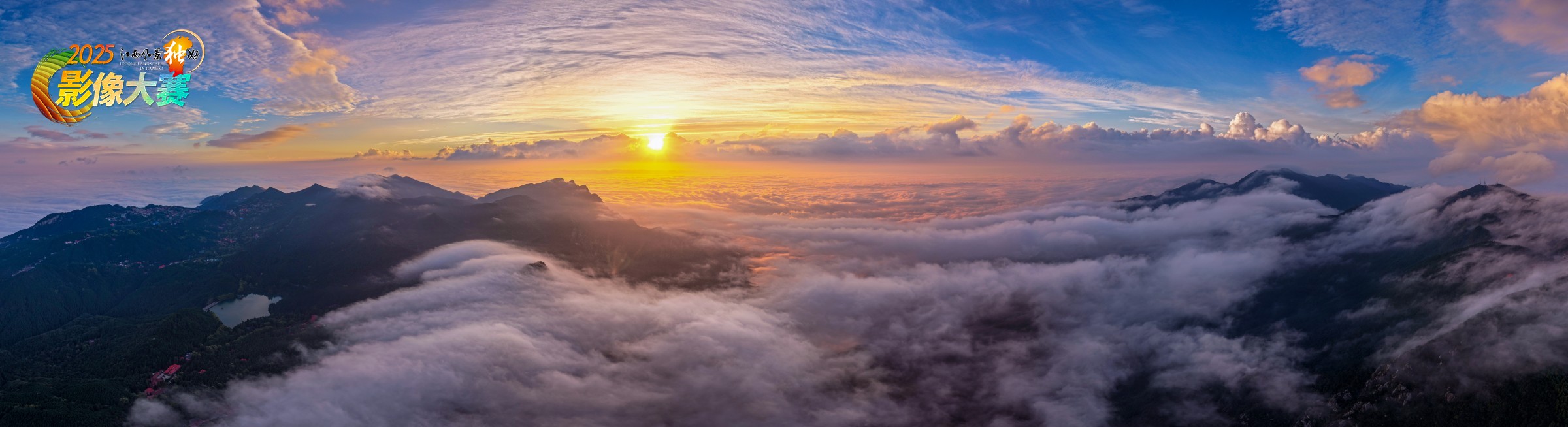 这是一幅壮丽的日出云海山峦图,拍摄于2025年9月26日江西庐山仰天坪。日岀时分,太阳在天际散发着耀眼的金黄光芒,云海如波涛般在山峦间翻涌,部分山峦、湖泊及牯岭山城在云雾中若隐若现,天空中还交织着蓝、橙等色彩,传递出雄浑、空灵且充满希望的氛围,尽显大自然的磅礴与壮美。