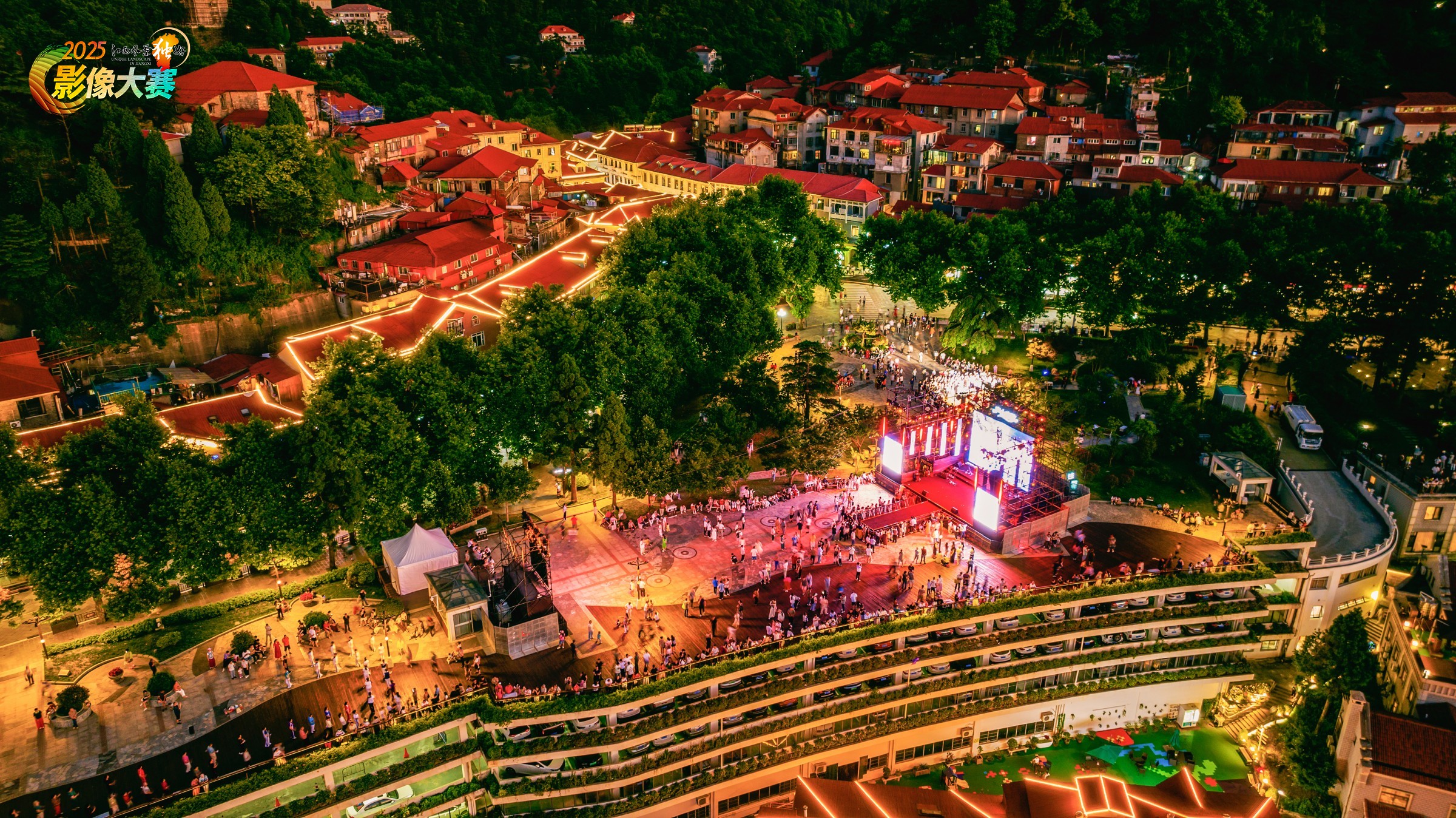 这是航拍的庐山牯岭小镇夜景,拍摄于2025年7月4日。图片画面红顶建筑错落,绿树环绕,广场上人群聚集,舞台灯光绚烂,传递出热闹、闲适的氛围,展现人与自然、人文活动融合的活力场景,尽显牯岭小镇夜生活的烟火与美好 。