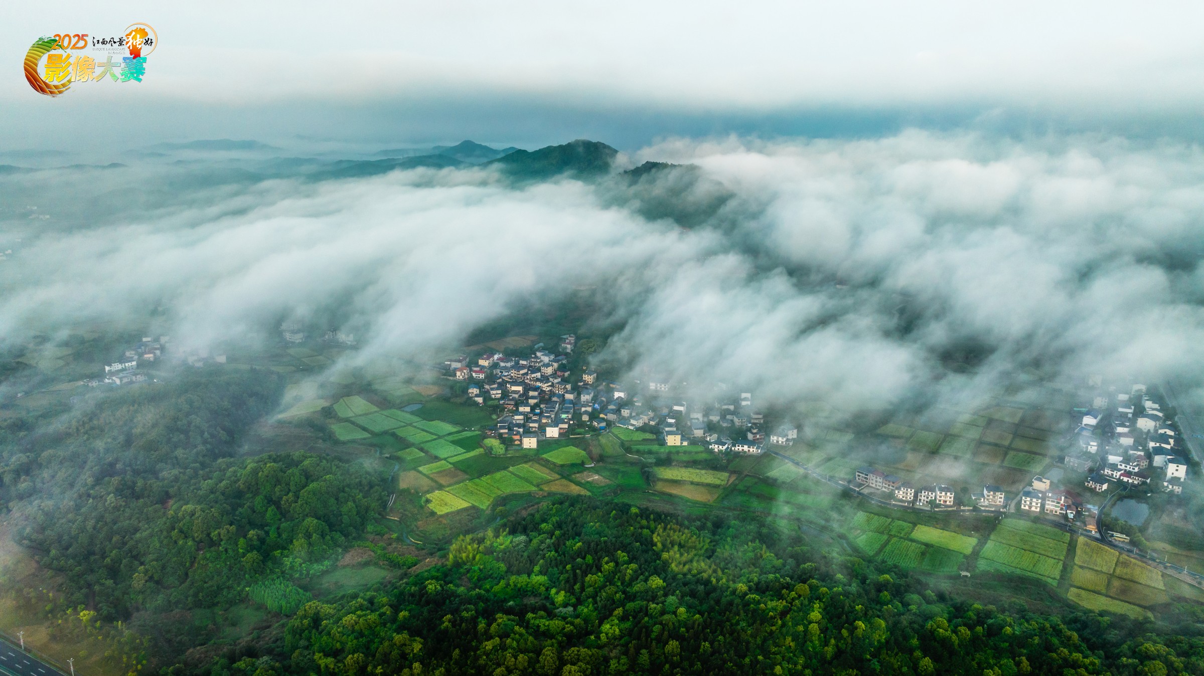 这是一幅航拍视角的乡村风景图。拍摄于2024年4月26日江西庐山东林古镇。画面中,云雾如轻纱般弥漫在山谷间,将连绵的山峦与错落有致的村庄半遮半掩,营造出如梦似幻的氛围。村庄里,房屋排列有序,白墙灰瓦在绿色田野和树林的映衬下格外显眼。大片的农田呈现出深浅不一的绿色,显示出不同农作物的分布,周围则是茂密的森林。远处的山峦在云雾中若隐若现,层次丰富。整体画面展现了乡村在云雾笼罩下的静谧与壮美,仿佛世外桃源,给人以宁静悠远、超凡脱俗之感。