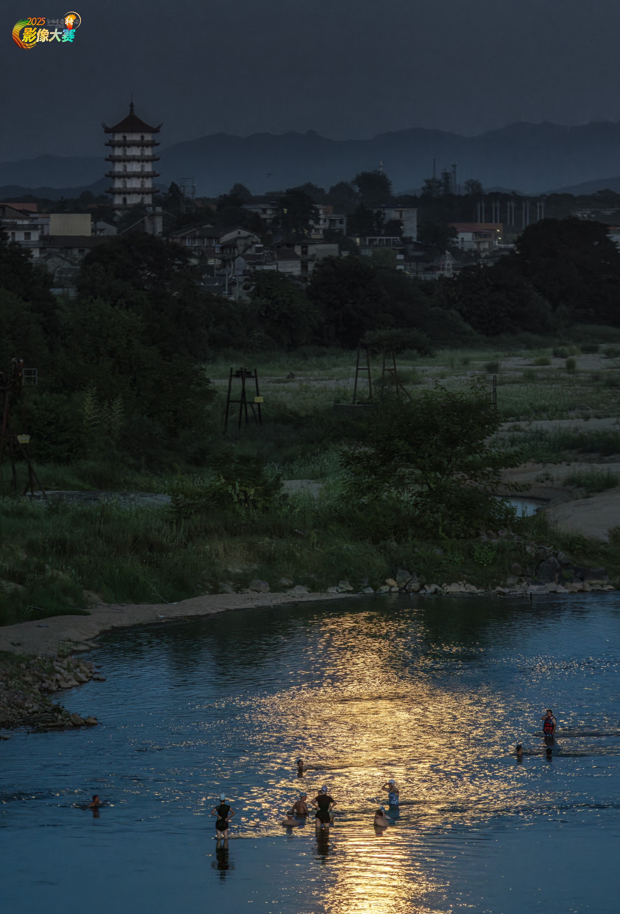 拍摄于月全食当天,始建于北宋治平年间的宝岩古塔塔前水面如镜,倒映着天光与塔影,金色满月升起之时,月光如碎银倾泻江面,波心荡开千层金箔,每道涟漪都藏着星子醉落的轨迹。