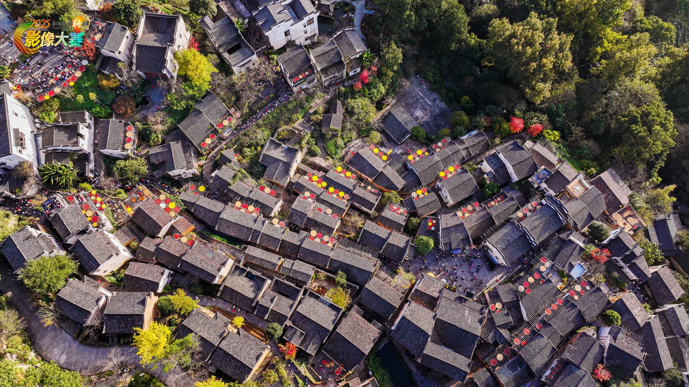 篁岭古村的黛瓦屋顶上,竹匾层层叠叠,红辣椒、黄玉米、金稻谷铺满其间,色彩斑斓如调色盘。村民穿梭于晒架间翻晒作物,炊烟袅袅升起,黛瓦、彩粮与远山相映,满是古村秋日的丰收烟火气。