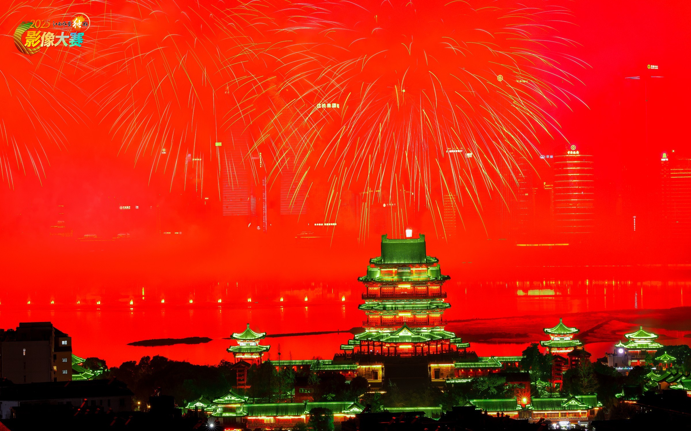 时间;2024年4月7日。地点;南昌市。滕王阁在烟花映衬下更显瑰丽,金碧辉煌的楼阁与色彩光影交织十分壮观。