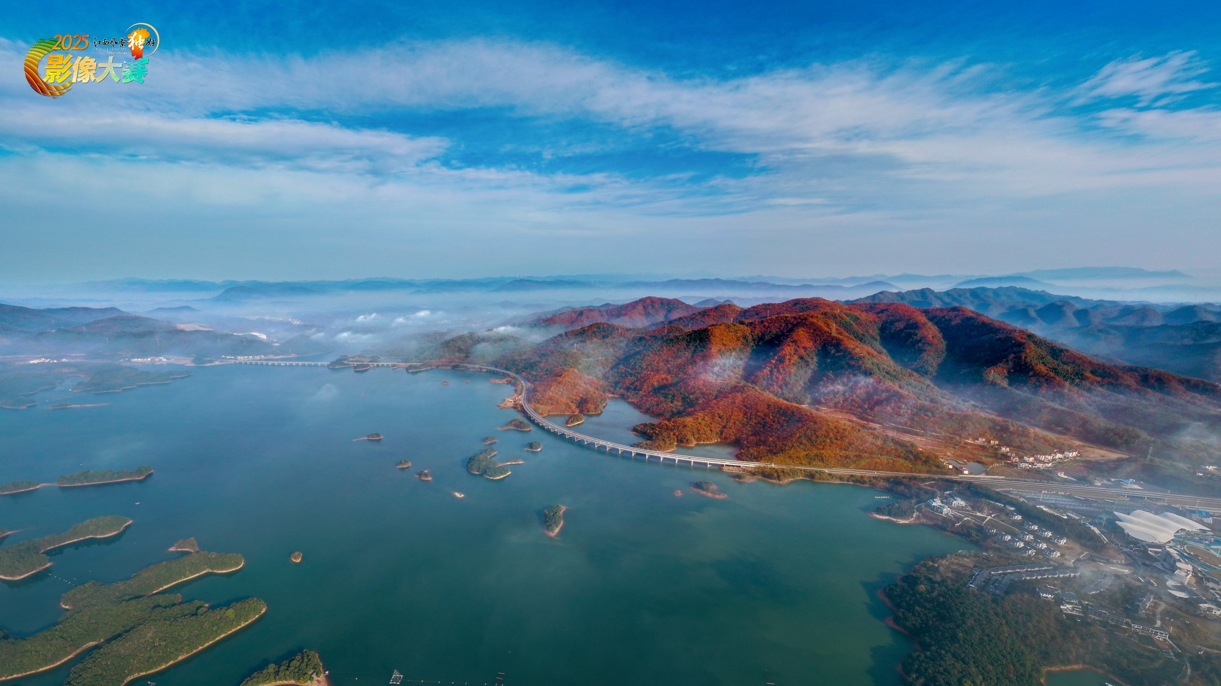 秋天的西海,山岗被染红,薄雾轻绕,高速公路在水上蜿蜒而过,令人神往。