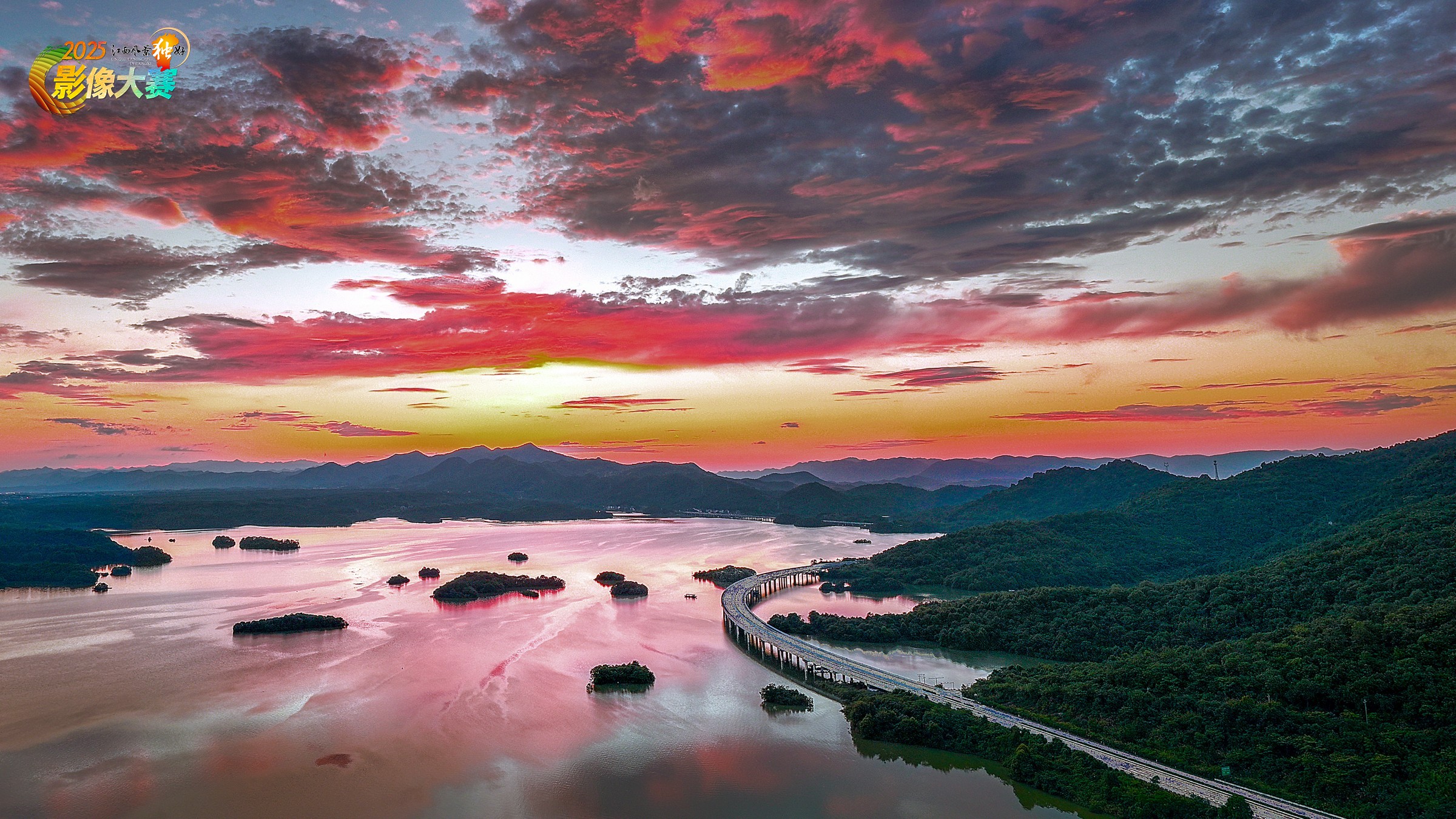 庐山西海,晚霞染红了天空,天空映红了水面,水面倒映着高速公路:人间奇观,醉美高速!
