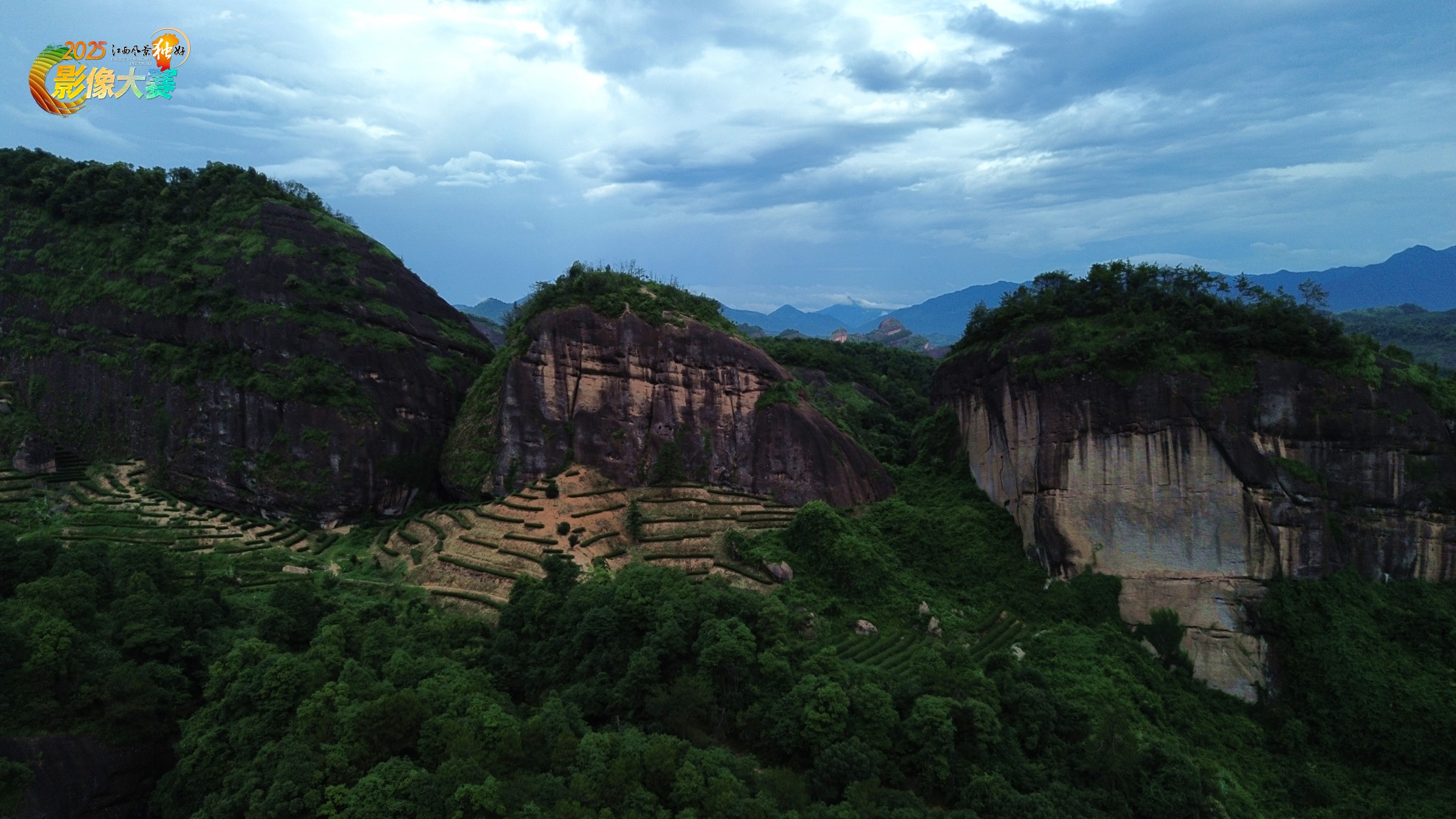 该作品拍摄于2025年6月14日,展现的是龙虎山丹霞地貌与人文农耕交融的风貌,核心特质解析如下: 1. 地貌与人文共生:画面以“丹崖+翠畬”为核心——红褐色丹霞崖壁纹理粗粝,底部错落的梯田(畬)是当地居民依托地貌开垦的农耕景观,实现了自然地貌与人文生产的巧妙融合,尽显“山水养人”的生机; 2. 空间意境:近景的层叠梯田、中景的丹崖翠嶂,与远景的朦胧山峦、云岚呼应,营造出“烟峦栖谷”的幽寂氛围;偏冷的色调(灰蓝天空+深绿植被)更添秘境的静谧感,却因梯田的存在保留了生活温度; 3. 文化关联:龙虎山作为道教圣地,“栖谷”既呼应道家“隐于山水”的理念,也暗合丹霞地貌“藏秀于野”的特质,让自然景观与人文生活、道家意境三重融合。