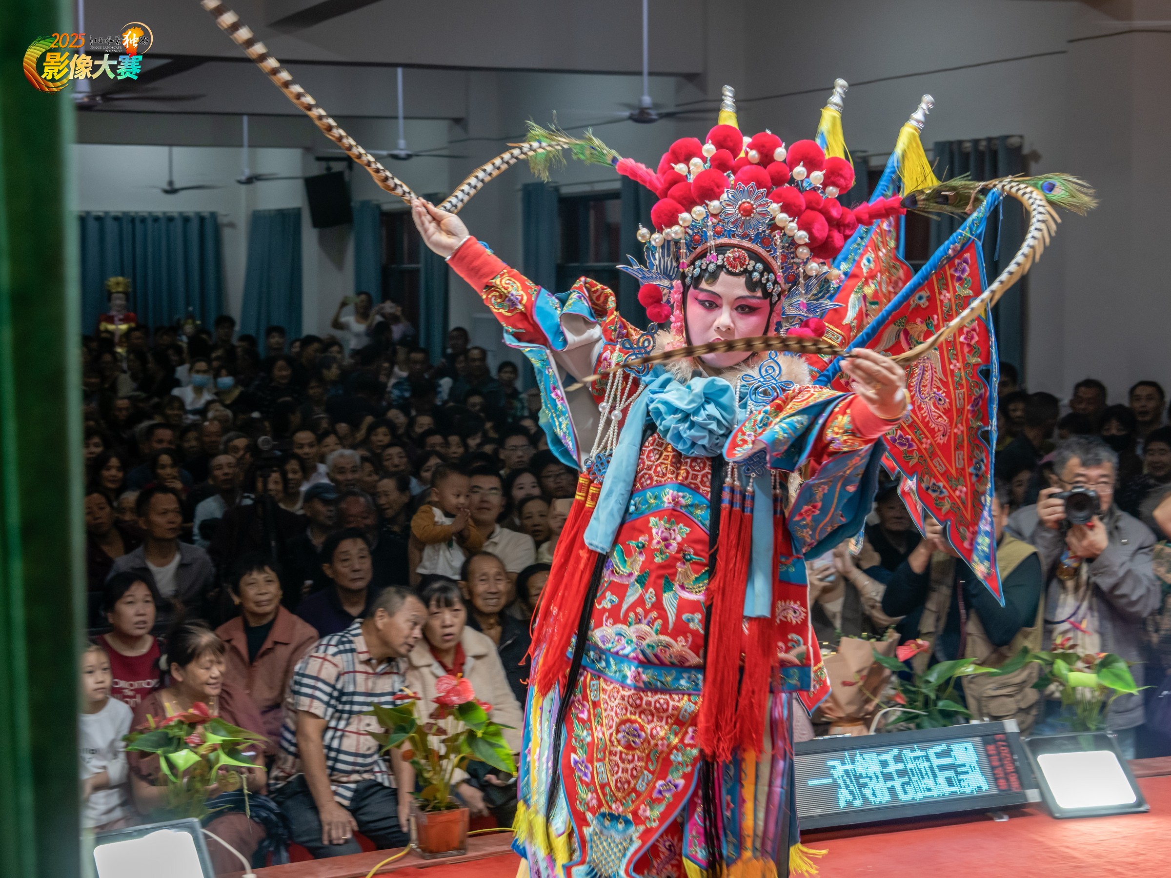 图片拍摄于2024年10月2日庐山市华林镇桃林村。这张图片捕捉了戏曲表演中的精彩瞬间。国家级非遗—西河戏,演员扮相华丽,身着色彩斑斓、绣工精美的戏服,头戴缀满绒球、珠翠的凤冠,手持翎子进行表演。翎子随着动作灵动飞舞,展现出戏曲表演的独特魅力。背景中,一群观众正专注观看,有的手持相机记录,现场氛围热烈,体现出戏曲艺术在民间受欢迎的程度,也彰显了传统文化的深厚底蕴与活力。