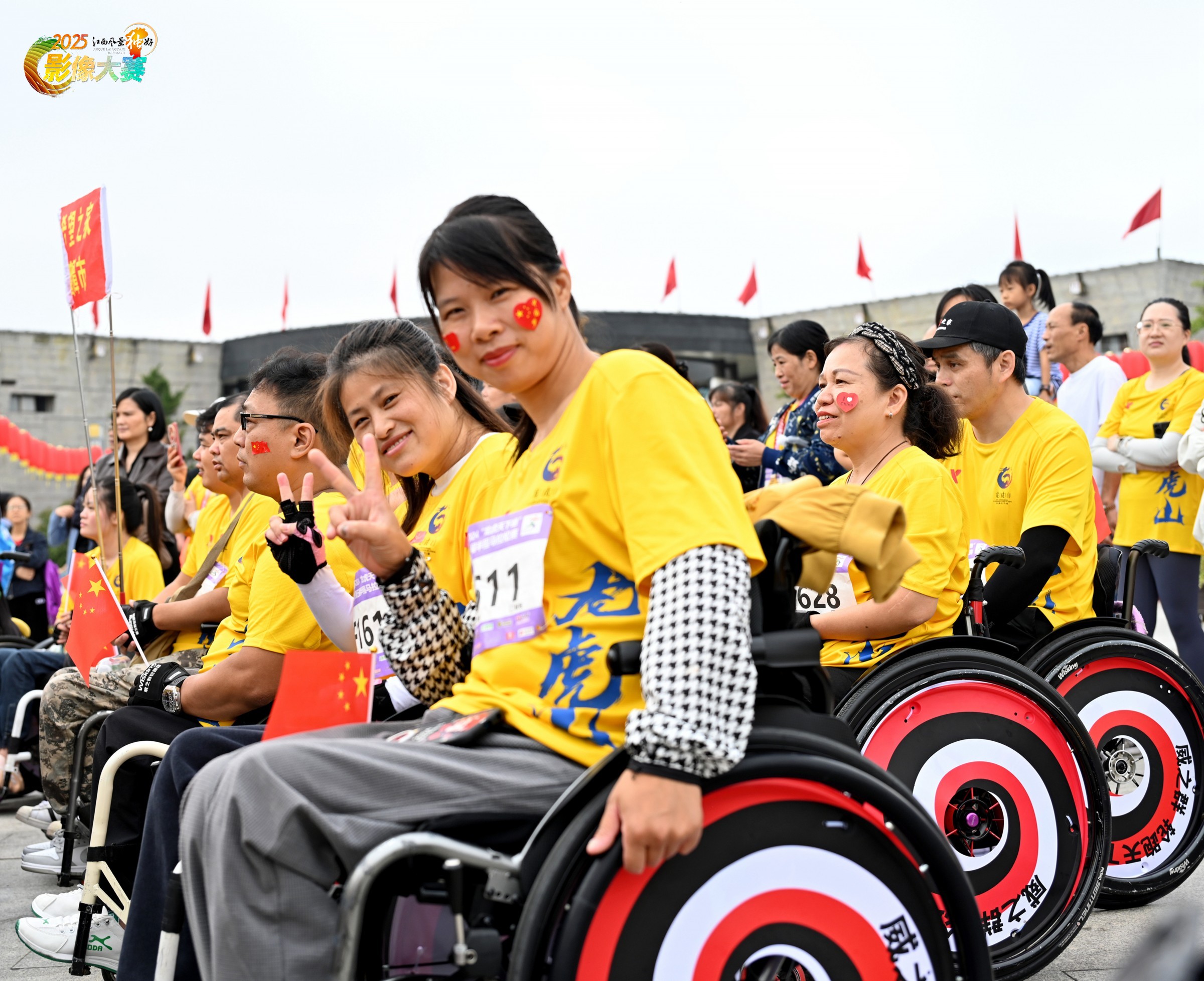 画面聚焦轮椅跑者群体,鲜亮的黄色队服如阳光般温暖,跑者们或比出“V”字手势、或展露灿烂笑容,脸上的国旗贴纸更添热烈氛围。他们身处赛事场景中,既展现出残障人士参与活动的积极与乐观,又让“阳光”般的精神力量在轮椅旁肆意传递,恰似一群追光者,用笑容与姿态诠释着对生活的热爱。