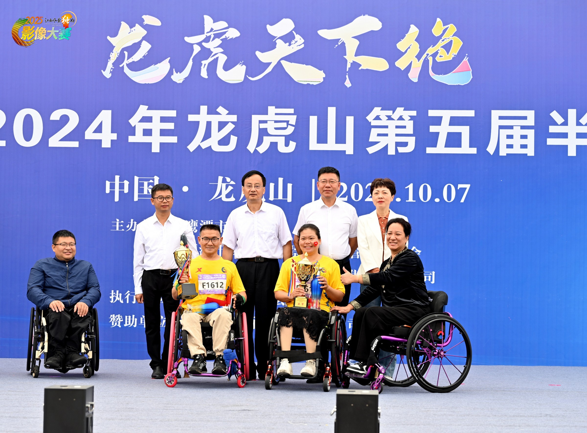 画面定格龙虎山半程马拉松颁奖场景,轮椅跑者手捧奖杯立于台前,鲜亮的黄色队服与蓝色背景板形成强烈视觉冲击,“龙虎天下绝”的赛事主题更添豪迈感。他们身处荣誉时刻,既展现出残障运动员在赛场上拼搏后的荣光,又让“突破自我、与龙虎同辉”的精神透过轮椅传递,恰似以奋斗之姿,在人生赛道上书写“绝”世精彩。