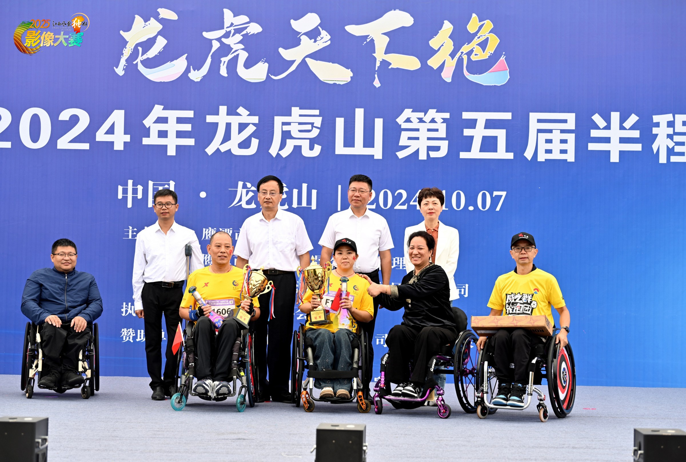 画面聚焦龙虎山半程马拉松颁奖场景,轮椅跑者手捧奖杯居于台前,鲜亮的黄色队服与“龙虎天下绝”的背景相衬,既展现出残障运动员在赛事中拼搏后的荣耀时刻,又传递出他们突破自我、如龙虎般昂扬的精神力量,恰似以轮椅为翼,在人生赛道上书写“绝”不平凡的壮志篇章。