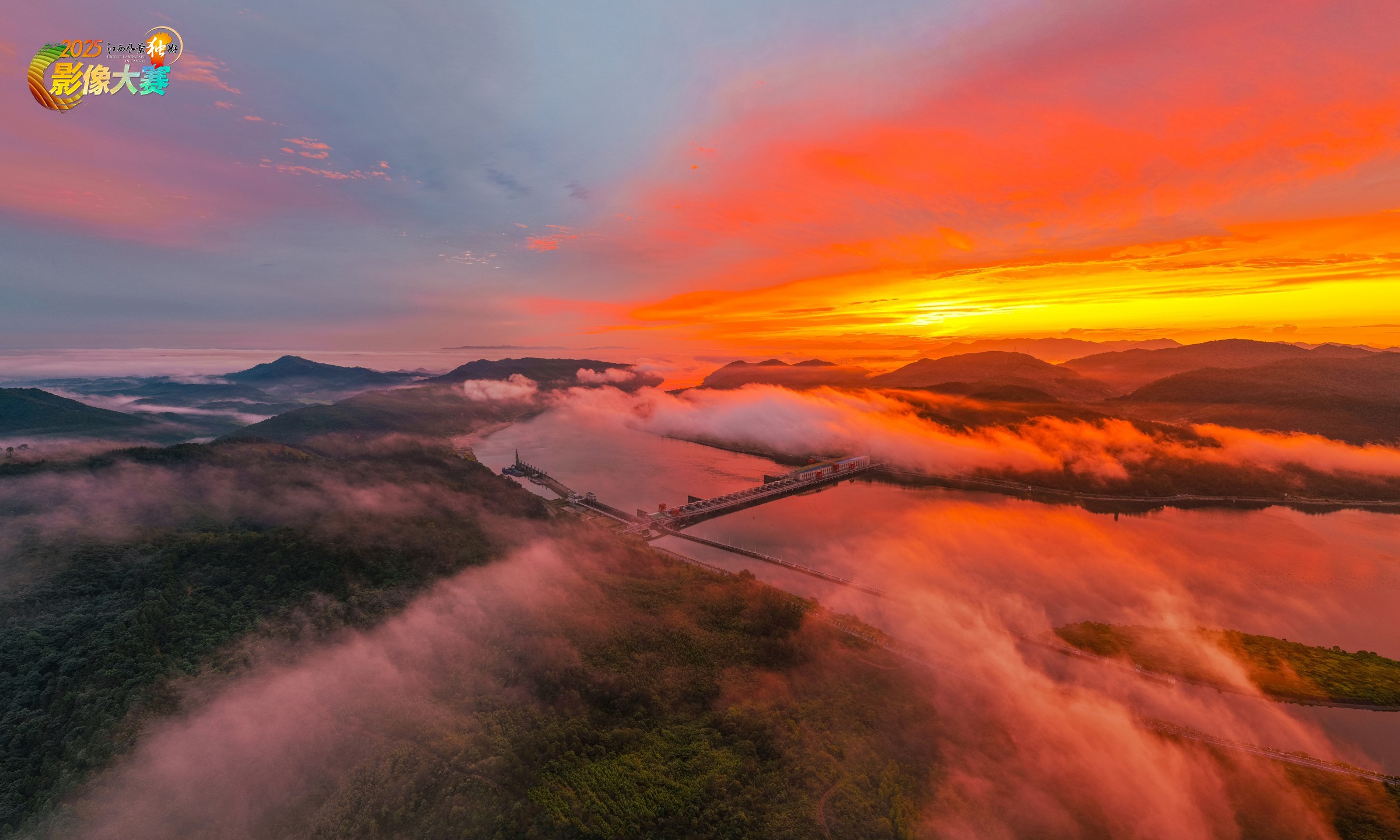 江西省吉安市峡江县水利枢纽朝霞云海风光