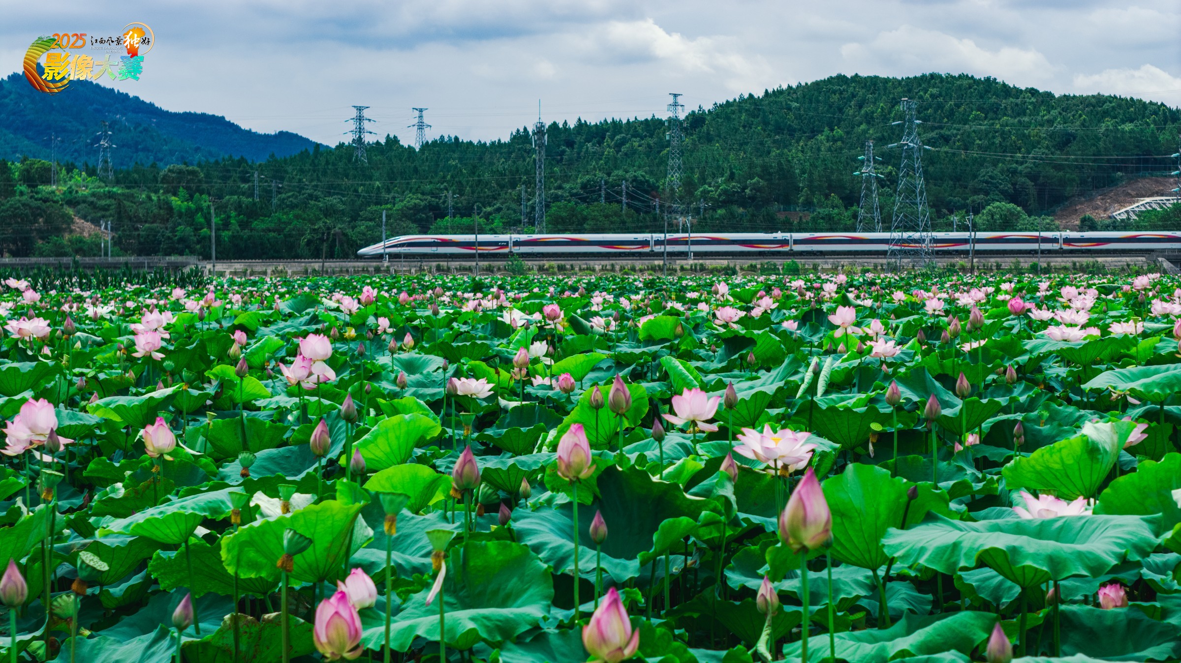 江西省吉安市峡江县水边镇昌吉赣高铁经过荷花水塘的画面。