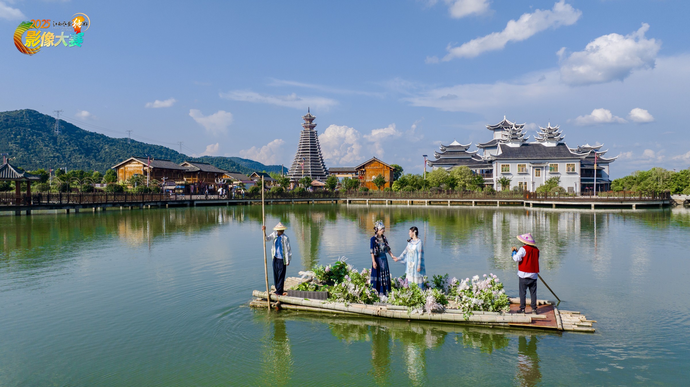 江西省吉安市峡江县金坪民族乡的苗族姑娘在竹排上唱山歌的画面。