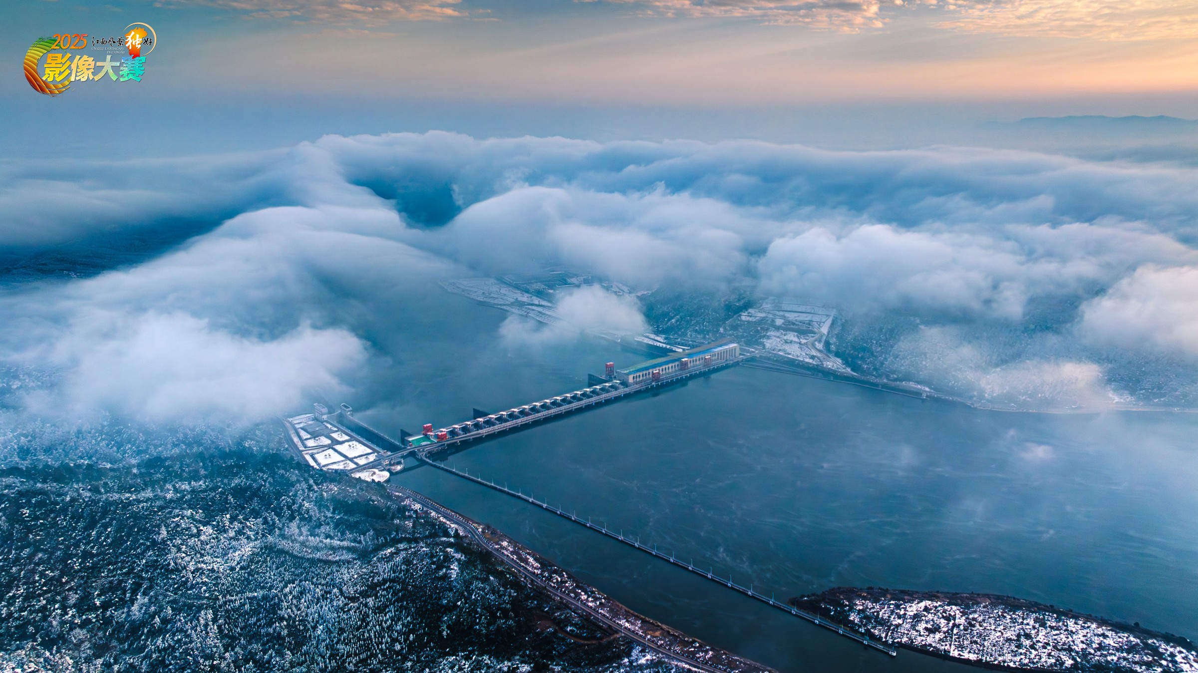 江西省吉安市峡江县水利枢纽雪景云海风光