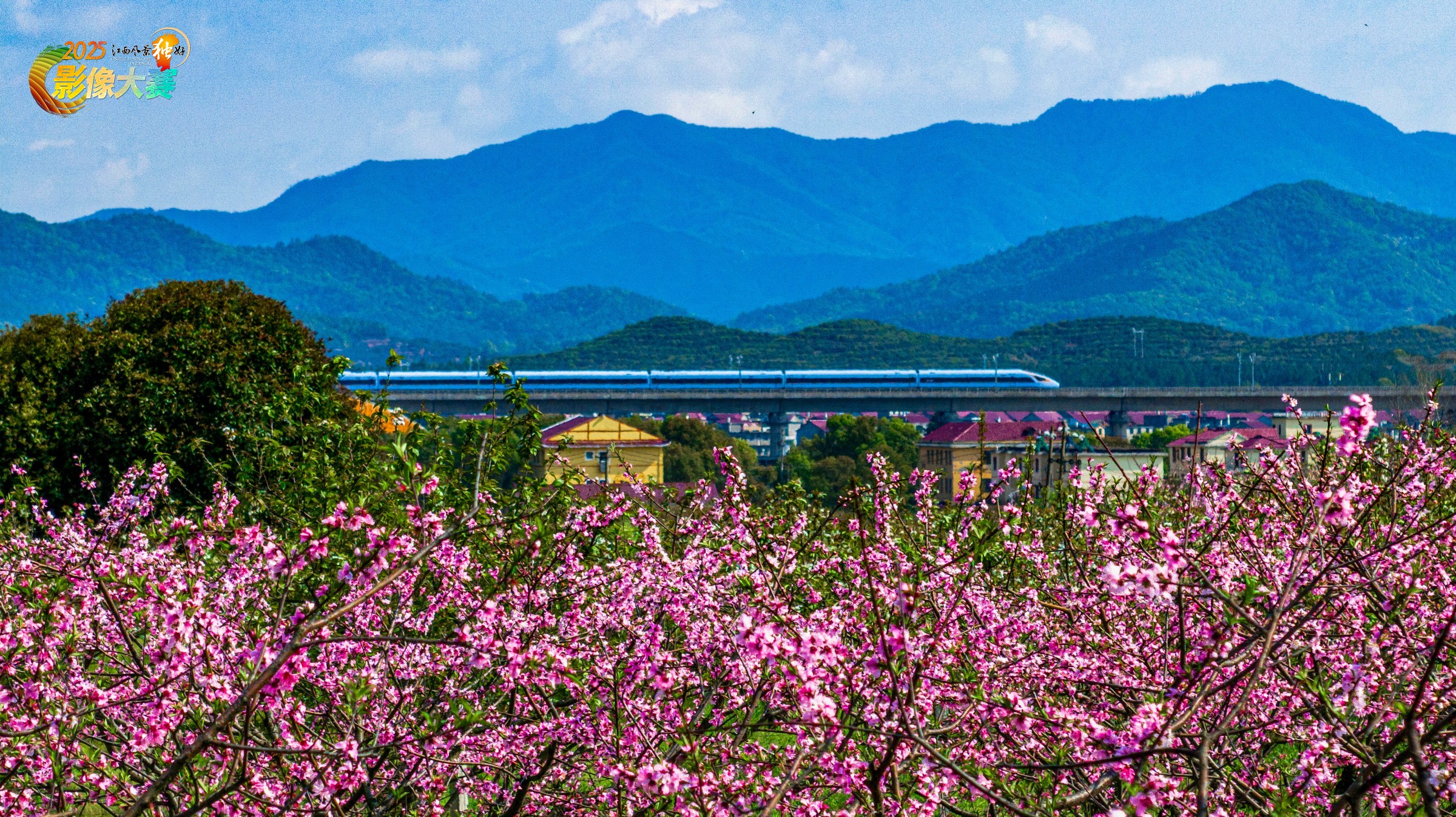 江西省吉安市金坪民族乡桃花开时高铁经过的画面。