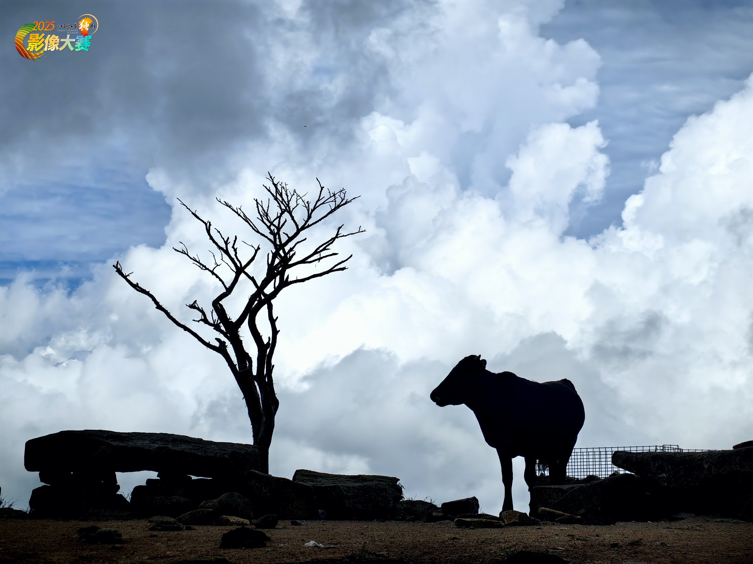 武功山铁蹄峰景点处,草木茂盛之夏季,枯树却不逢春,恰有黄牛经过驻足,恬静沉思画面你我之牛马路。