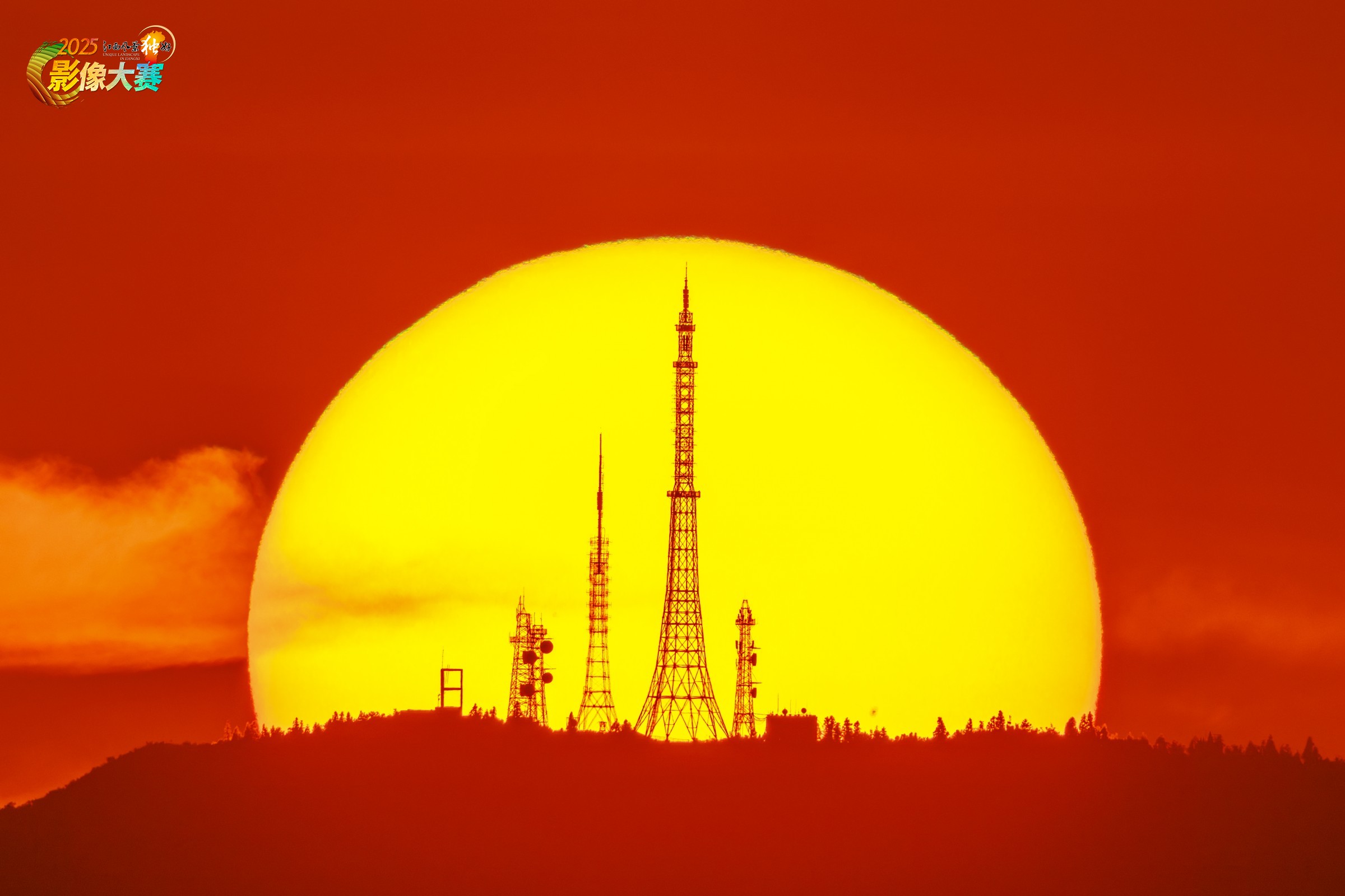 在梅岭山顶,数座信号塔在落日的渲染下,轮廓分明。巨大的落日如同一轮金黄的圆盘,将天空晕染成热烈的橙红色,信号塔在这梦幻的背景中,仿佛童话里的城堡塔楼,与山间的树林相映成趣,科技的硬朗与自然的壮美在此刻交融,构成了一幅超现实的绝美画面,尽显梅岭黄昏的独特韵味。