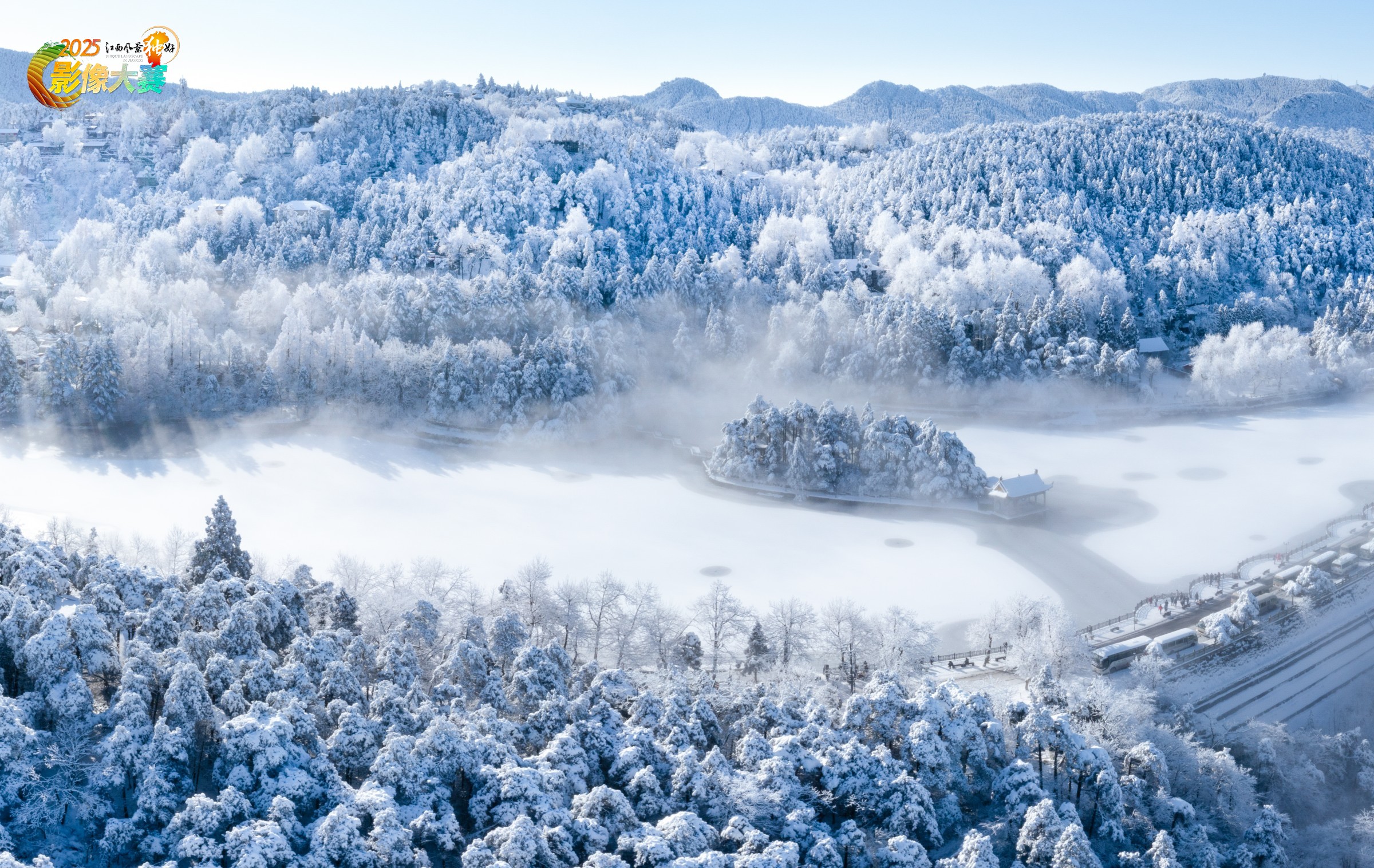 拍摄于庐山如琴湖的冬日雪景时刻,采用航拍视角,将被皑皑白雪覆盖的山林、结冰的湖泊与湖中的亭阁纳入画面。白雪的冷冽与建筑的古朴相映,林海的浩瀚与湖亭的精巧相衬,既展现了庐山冬日雪境的雄浑壮美,又透出一份江南山水的雅致朦胧,定格下庐山雪天里独有的诗意与苍茫。
