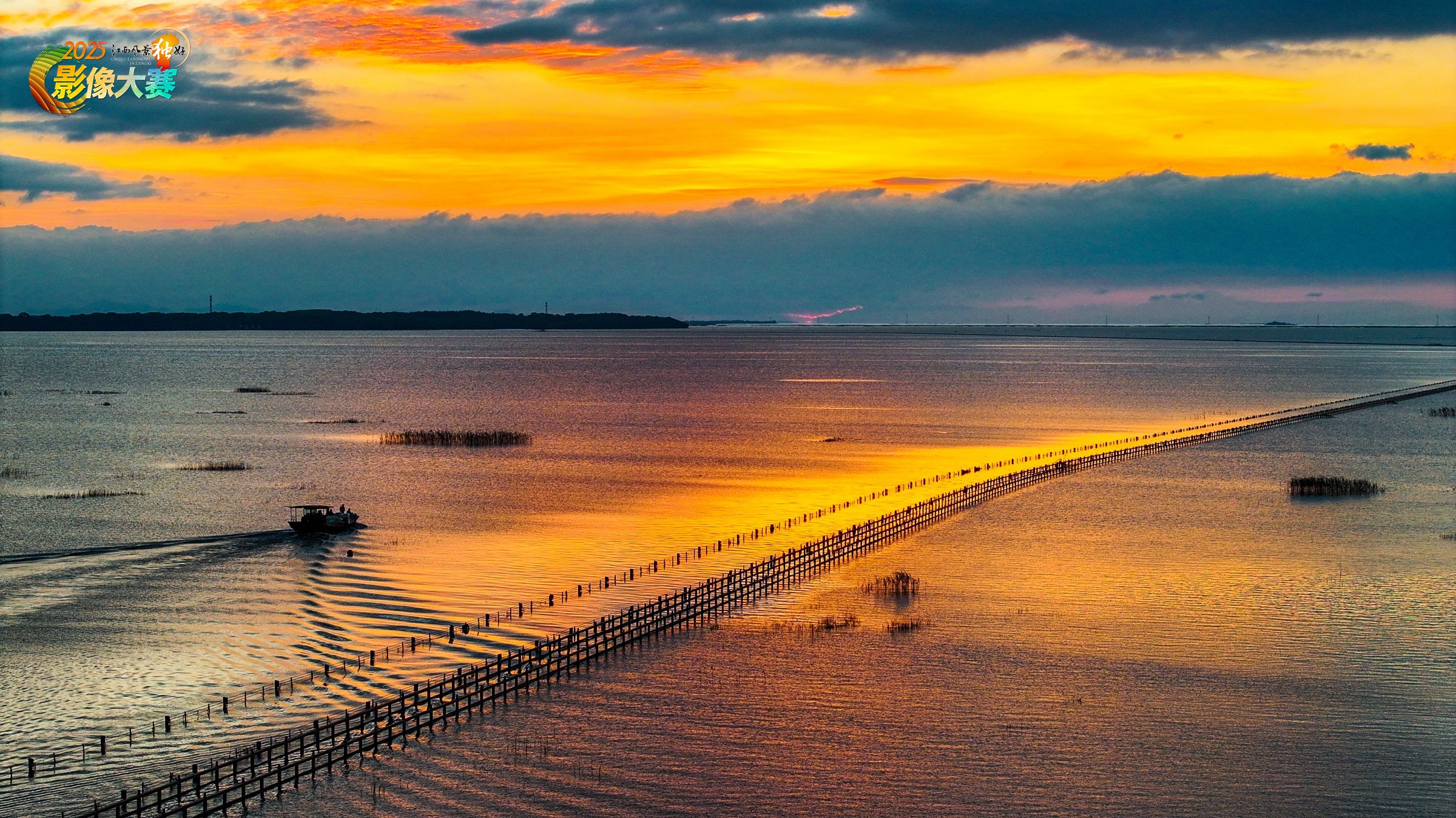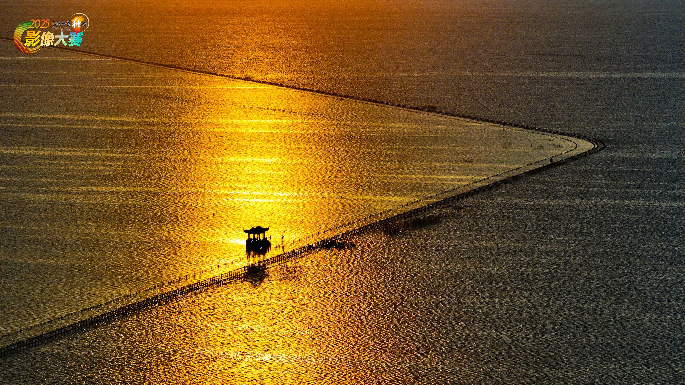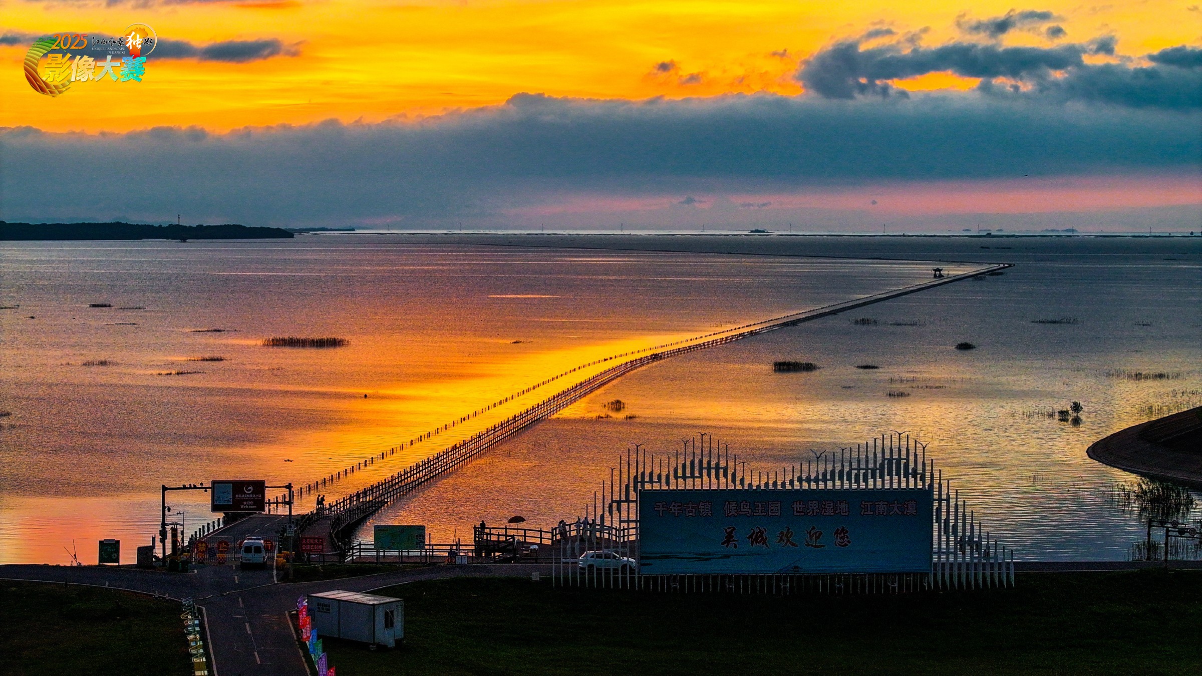 晨雾未散,江西省九江市永修县涨水后的永吴公路已与鄱阳湖温柔相拥,5.05 公里的路面浸在碧波中,只剩白色路桩如银线串向天际。朝阳破云而出的刹那,鎏金般的光洒满水面,公路化作流动的金带,在 “天空之镜” 中若隐若现。