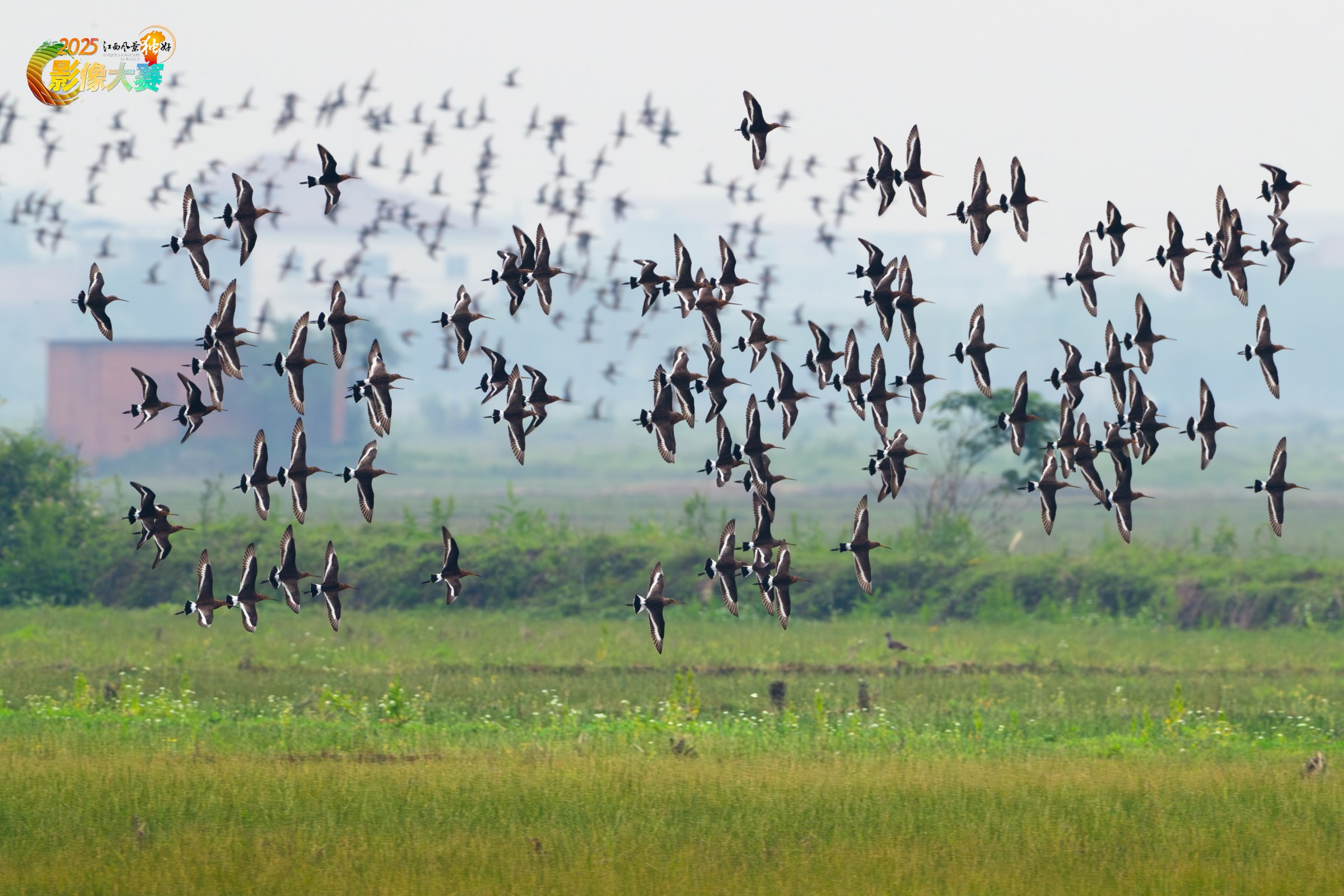 黑尾塍鹬在冬季的稻田与村庄之间自由翱翔。2025年4月30日拍摄于新建区松湖镇。