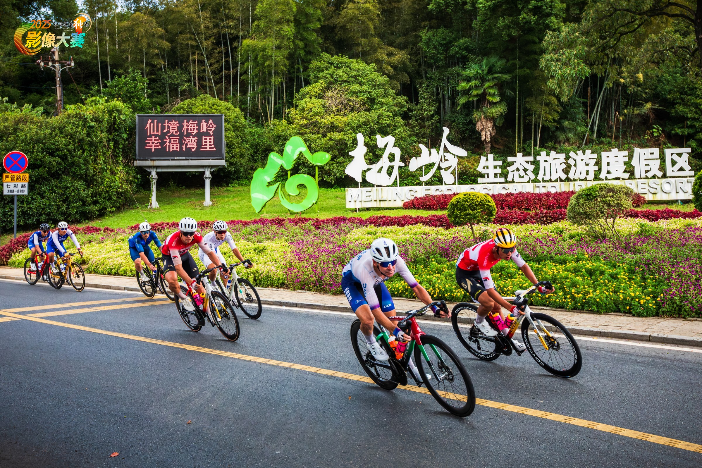 第十三届环鄱阳湖国际自行车大赛车队骑行在南昌梅岭风景区。2025年9月17日拍摄于南昌市梅岭风景区。